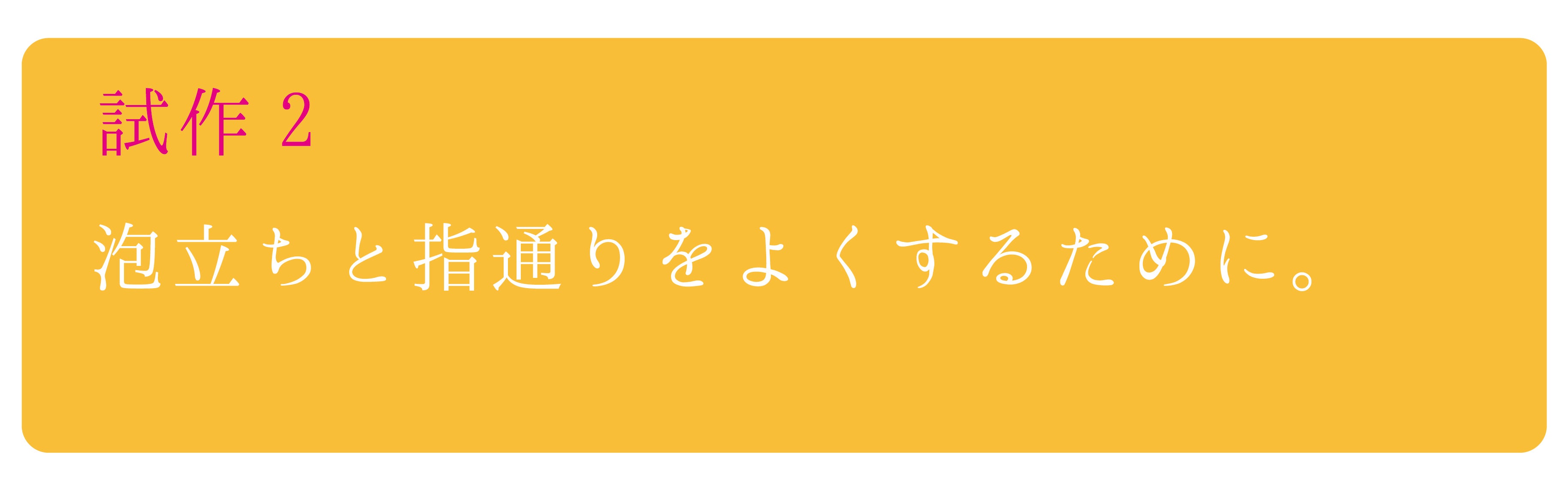 結果:シャンプーは頭皮のすっきり感は少し弱くなりました。ただ軋み感は試作2よりもよくなりました。これは他のオイルを加えたことによりできたものでした。しかしこの塩の配合では頭皮のすっきり感は試作1ほどではありませんでした。