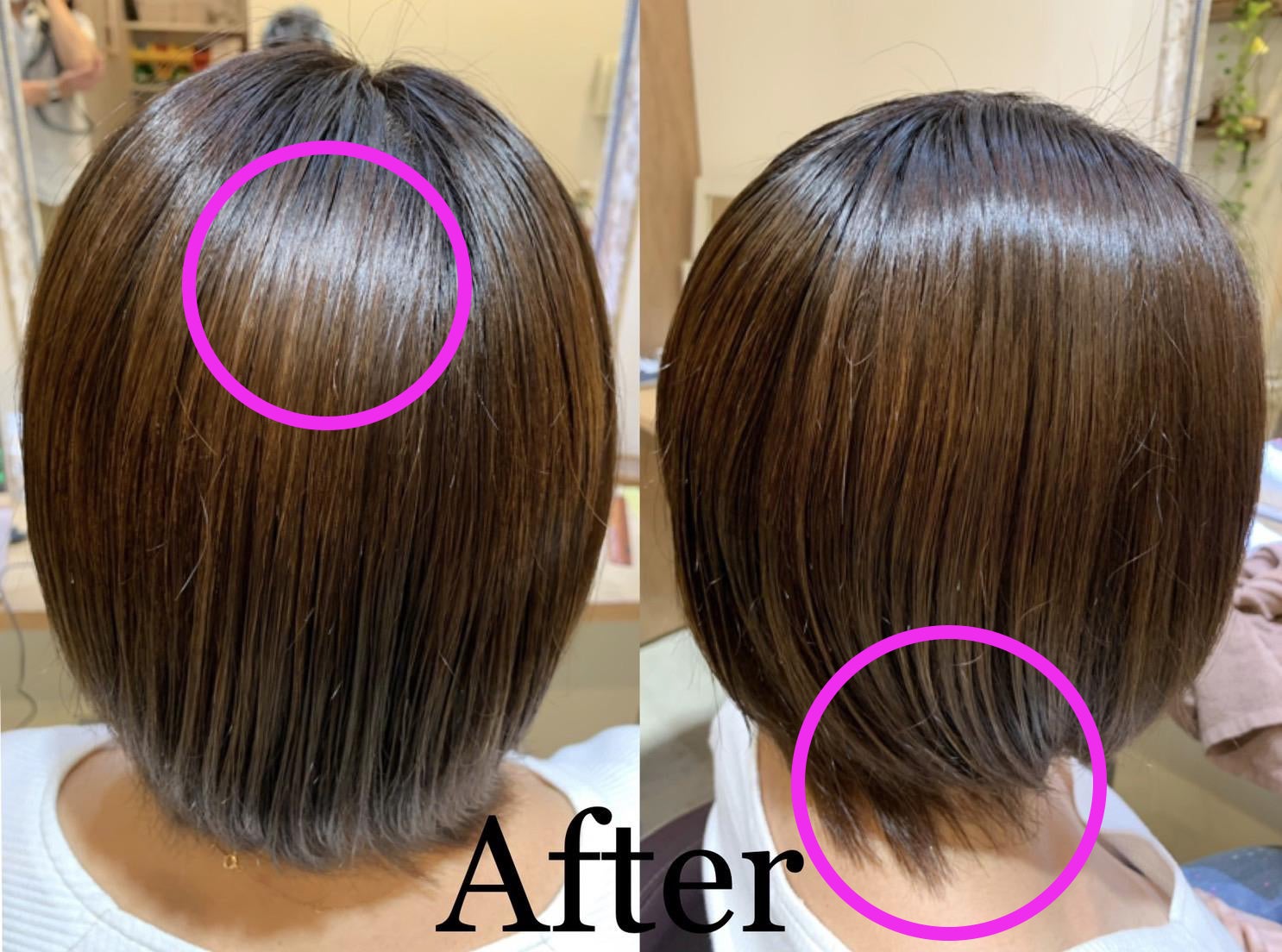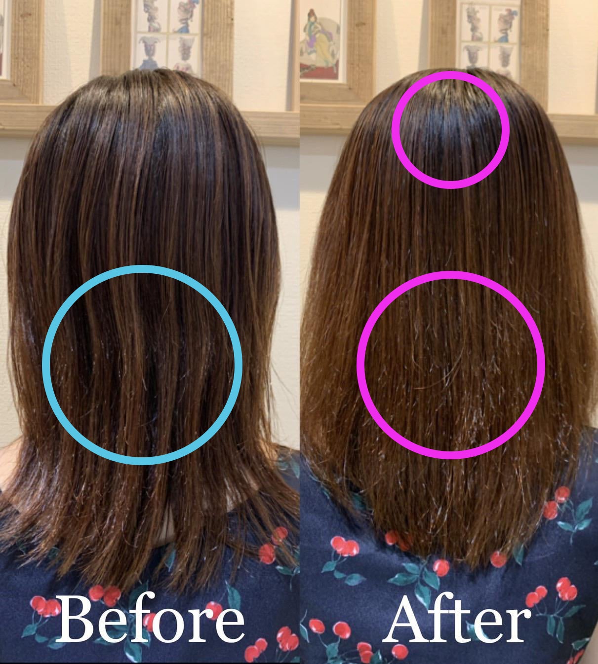 根元のボリュームと毛先の落ち着きに明確な差も見られて、艶もかなり増しています。
