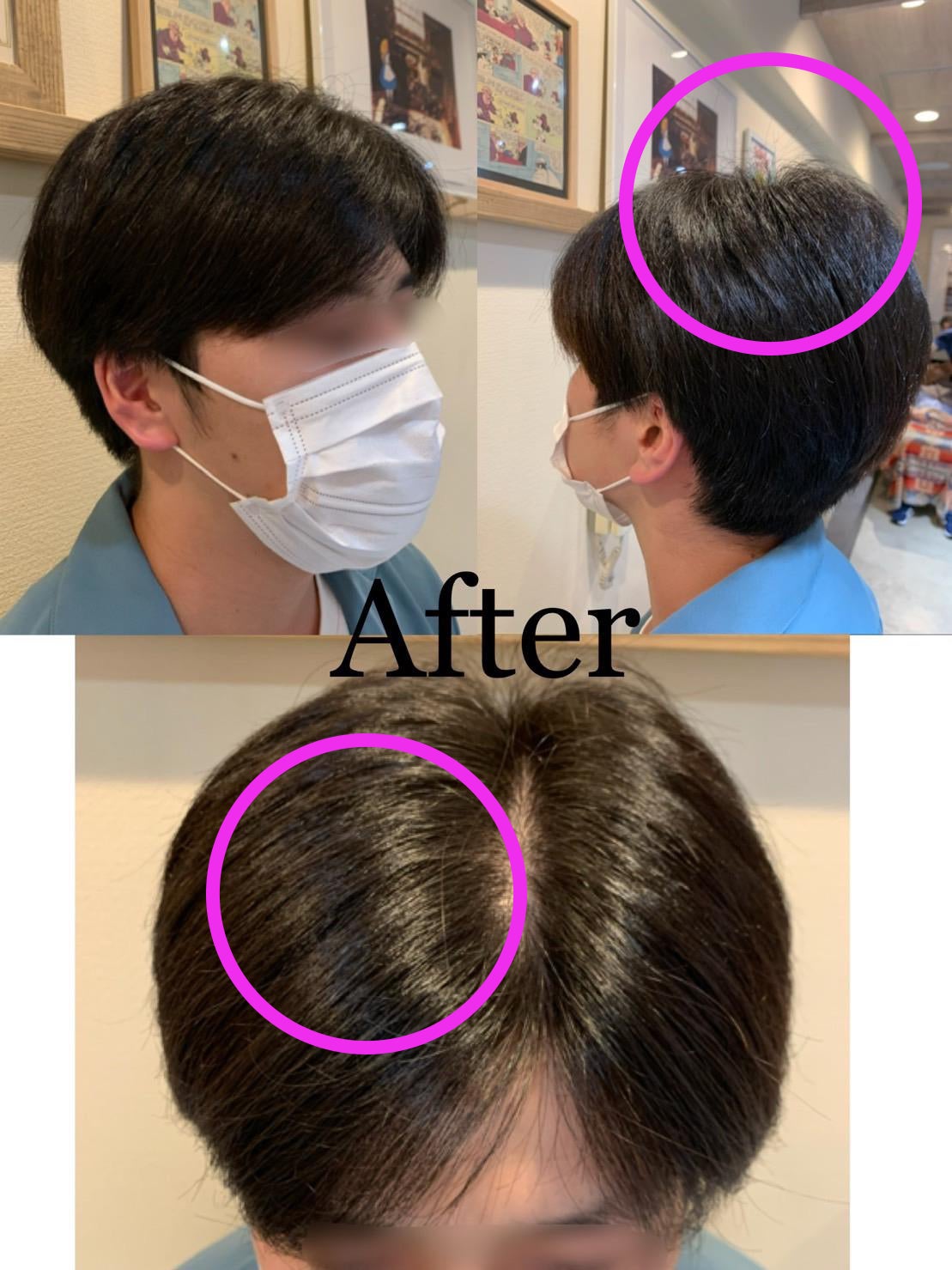 根元からの立ち上がりでボリュームアップ!そして毛先が内側に収まっています。シャンプーとコンデショナーだけでブローせずにドライしただけでこの仕上がりは驚異的。シャンプー直後に頭の軽さを強調、喜んでいただきました。