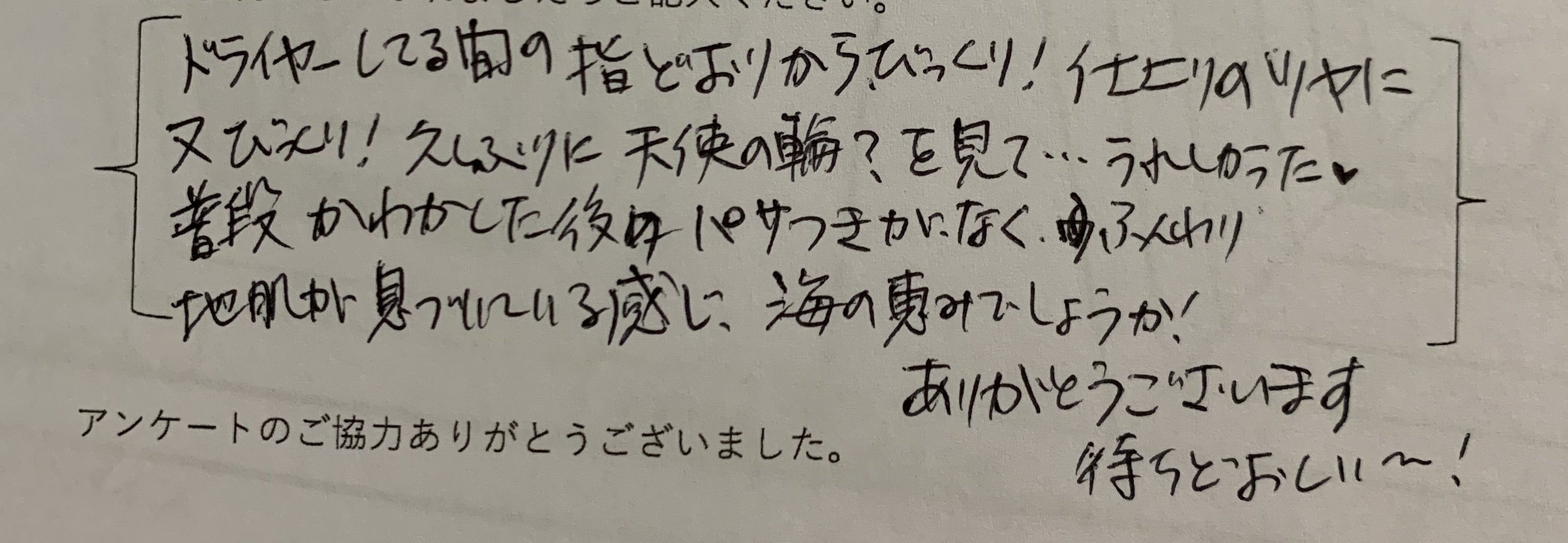 塩シャンプーが気持ち良くてお休みになってる方や、洗ってる最中からご自身のシャンプーとの違いを話して下さる方など早くも体感して頂いてる様子が伺えました!