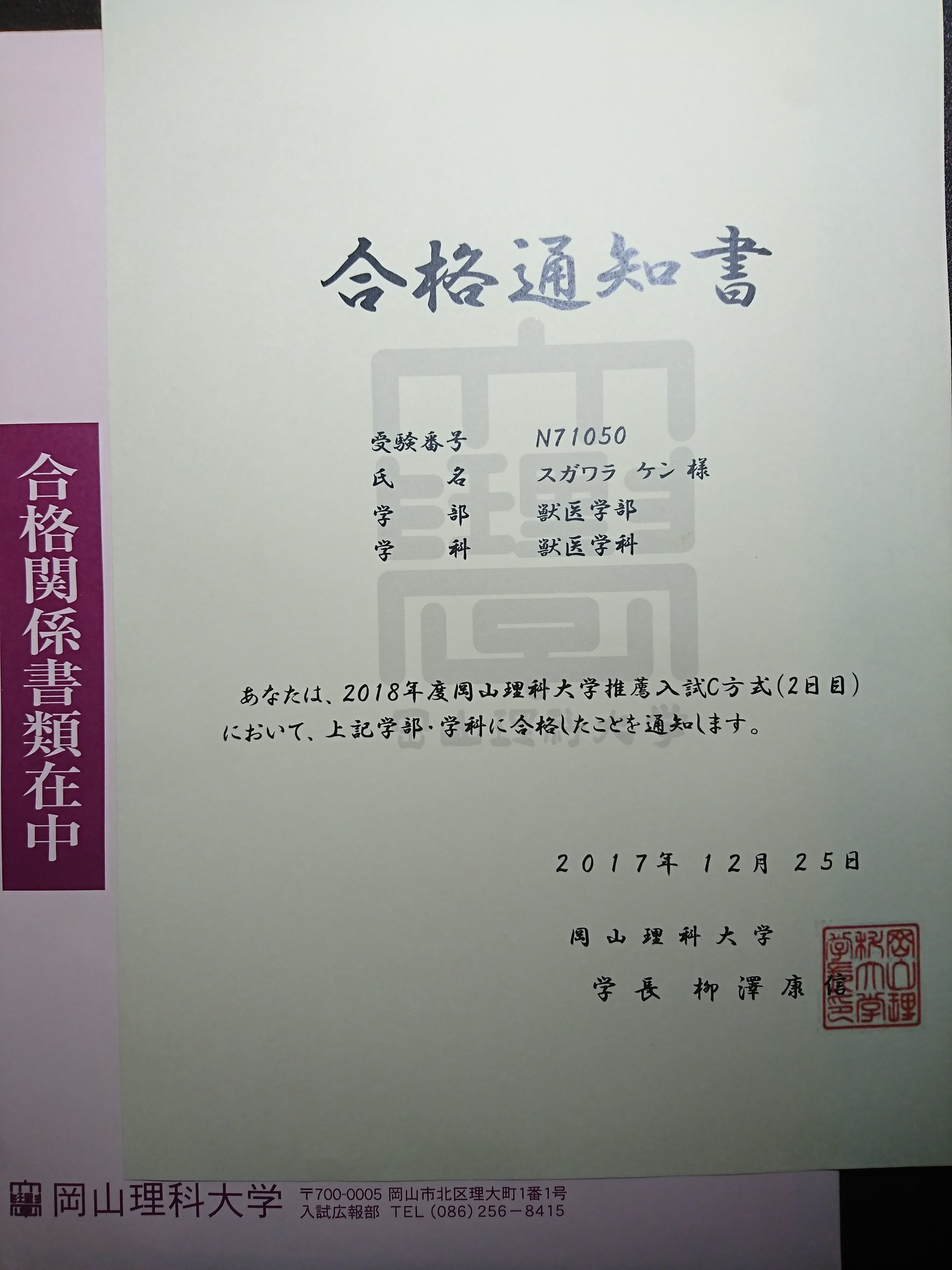 今更ながら、獣医学部挑戦1年目に岡山理科大学獣医学部に合格した際の