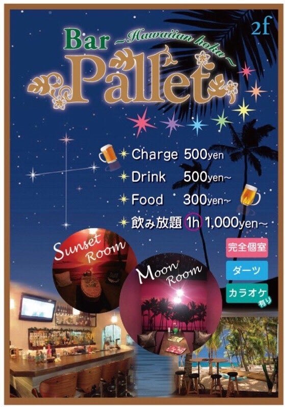 ハワイアンな店内にダーツ、カラオケ完備、全35席で完全個室をご用意しておりますので、完全なプライベート空間をお楽しみください。