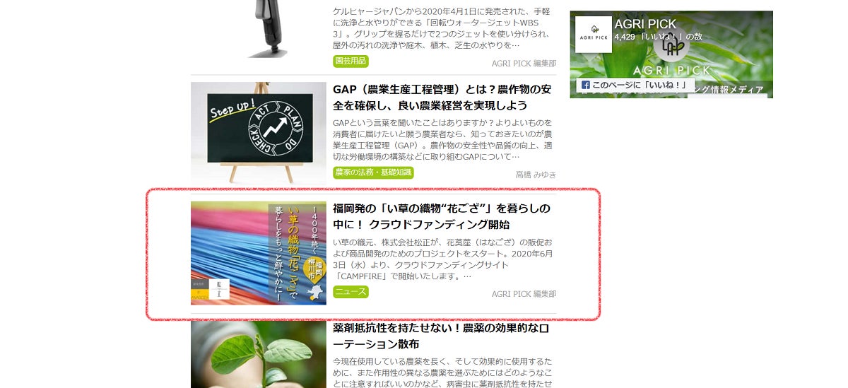 はじめに。本プロジェクトをご支援いただいた皆さま、おかげさまで、開始6日で目標金額67%に到達いたしました!!松正のスタッフ一同、心より感謝申し上げます。メディア掲載のご報告農業系webメディア『AGRI PICK』に、私たちのクラウドファンディングの紹介記事を掲載いただきました!『AGRI PICK』編集担当の皆さん、ありがとうございます!記事中では、「松正の花茣蓙を知る5つのポイント」もご紹介いただきました。実際の記事は、下記のURLからご覧いただけます。https://agripick.com/2610今回のクラウドファンディングを機に、これまでご縁がなかったメディアにも、自らを売り込みにいくことに挑戦しています。これからも応援よろしくお願いいたします!松永 正晴