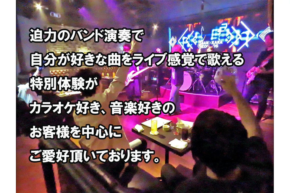 当店のバンドスタッフは凄腕揃い。カラオケに入ってる曲ならどんな曲でも楽譜無しで即興演奏し、お客様の歌を盛り上げます。