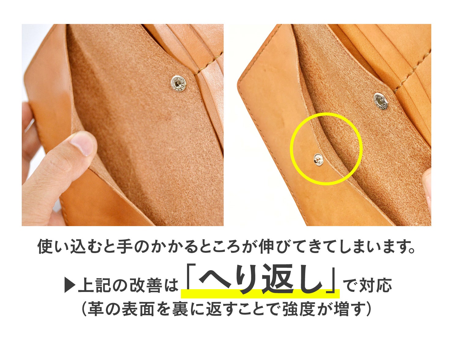 ・①へり返しによる強度の確保 ②豚革の貼り合せにより革のコシとお札の出し入れのしやすさ向上