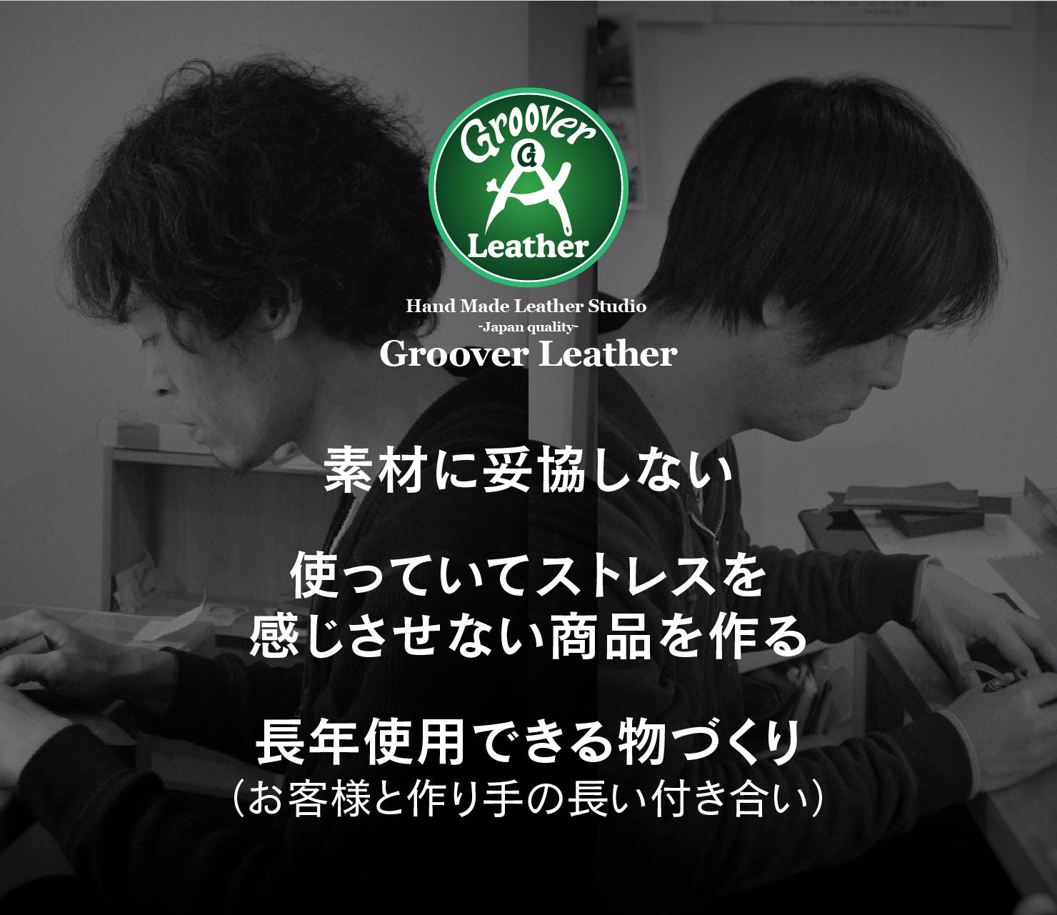 ●2人は元々同じ職場で働いていましたが、徳永は家具大工に転職し、職人の道を究めていきました。それと同時に趣味で革細工に没頭。長野県内のブランド内にある革工房で工場長(徳永)、副工場長(原山)というような立場でデザインから技術開発、商品製作等々を手掛けておりました。そこで培った”こだわりの精神” を胸に現在のグルーバーレザーを2017年に立ち上げました。