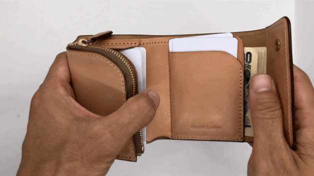 ●カード7枚、小銭、お札全て納めて20ミリで収まれば、スーツでも気にならない厚みであり、バッグポケットに入れた際でもそのまま座れる厚みです。