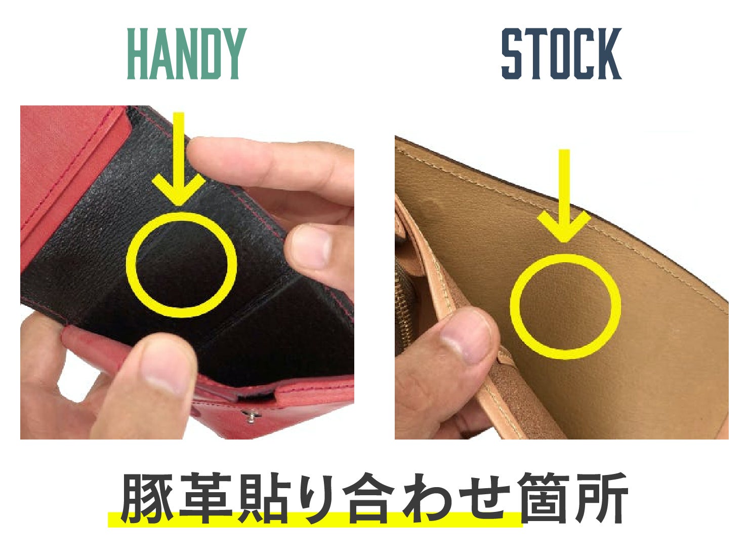 ・①へり返しによる強度の確保 ②豚革の貼り合せにより革のコシとお札の出し入れのしやすさ向上