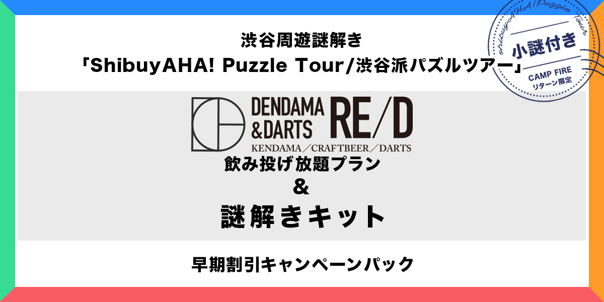 ShibuyAHA! Puzzle Tour/渋谷派パズルツアーキット一式とDENDAMA&DARTS RE/Dで飲み放題、DENDAMA&ダーツ遊び放題のついた大変お得なパックです。謎解き後は楽しいお酒もぜひ!渋谷をたっぷり満喫しよう!