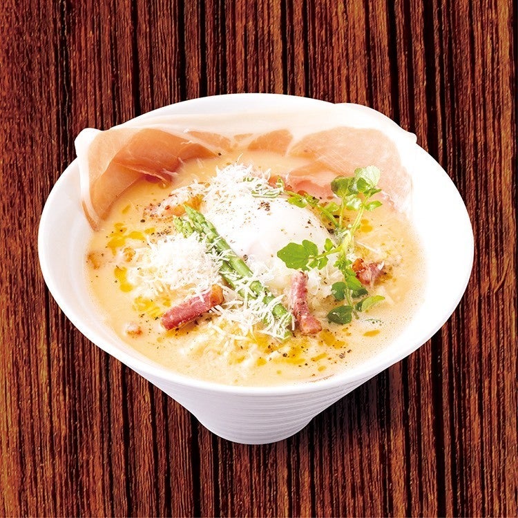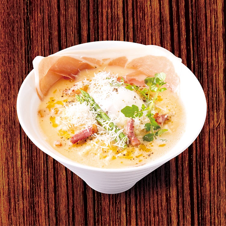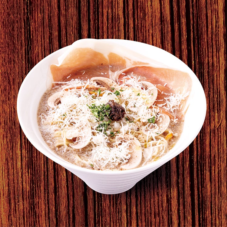 豚骨スープをベースにカルボナーラのクリーミーなソースが合わさってラーメンとパスタのいいとこ取りをしたような味わいです。食べたら意外!さっぱりとしていて「あ〜ラーメンだわ」とつい思ってしまう。そんなラーメンとなっています。