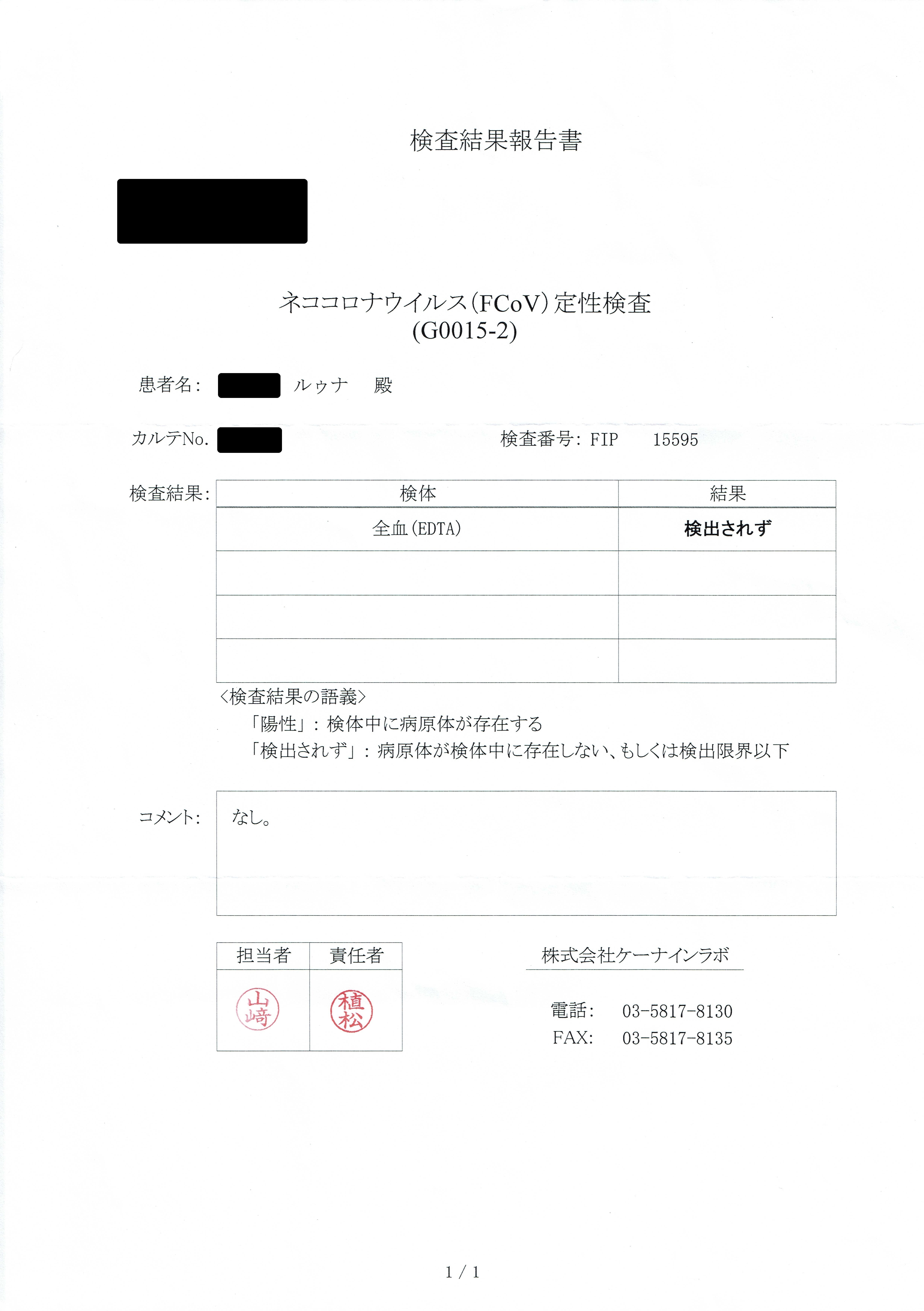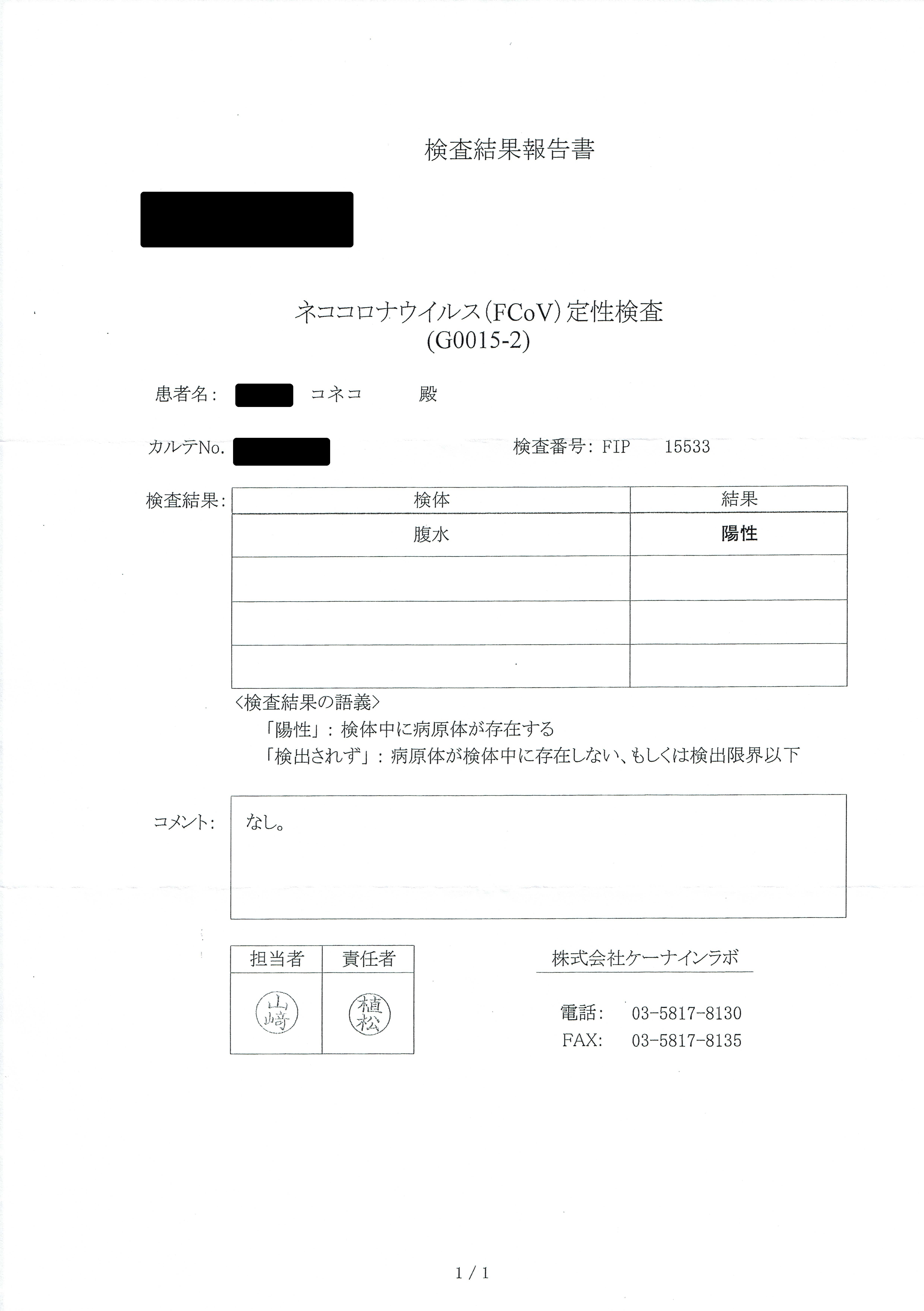 ちなみに陰性の場合は、FIPを完全に否定することはできず、他に原因がないか追加検査をしましょうと言われました。