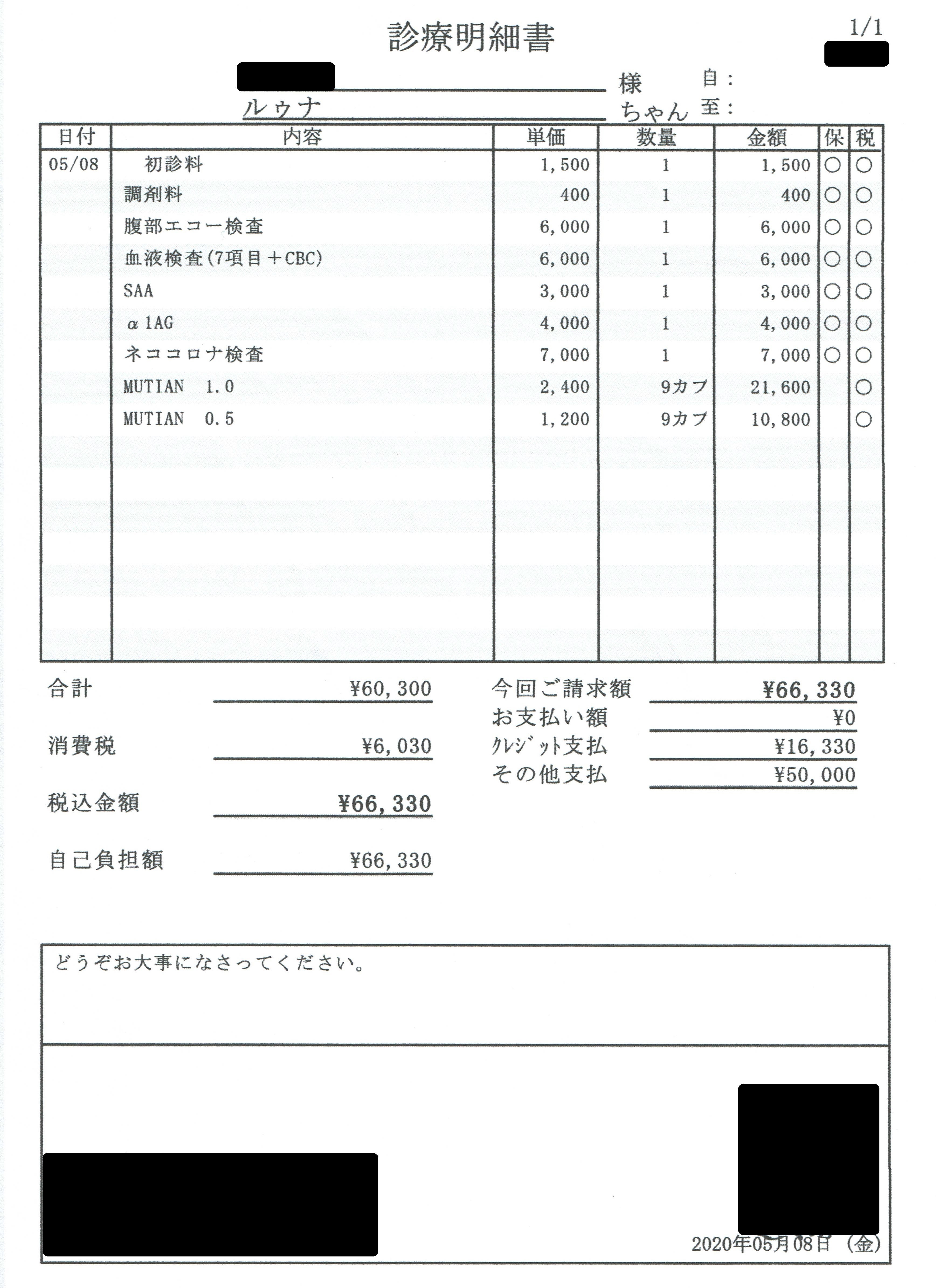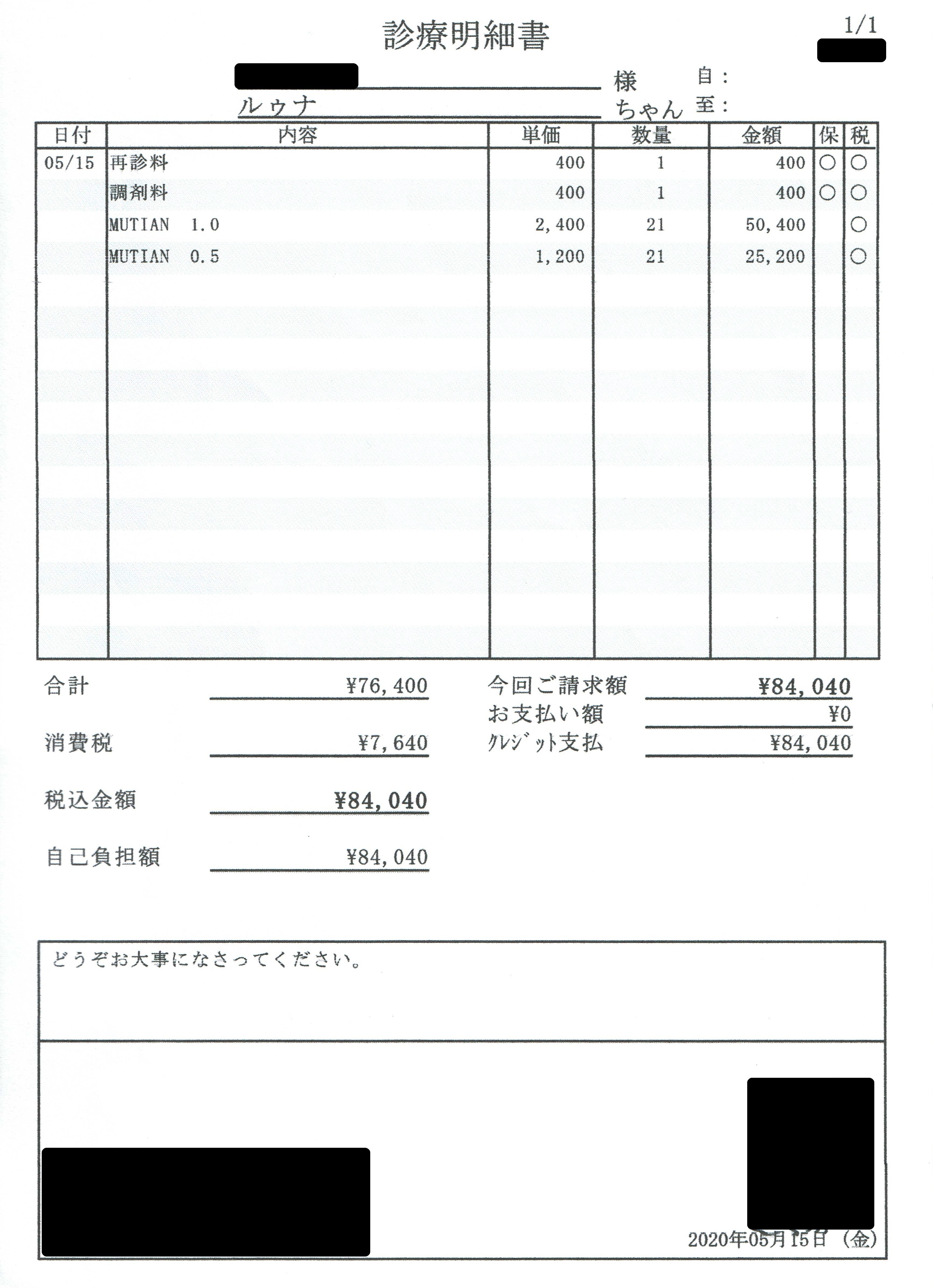 すべてルゥナの治療費(MUTIAN薬代×84日分、月1回の検査代×4回分)、手数料に使わせて頂きます。