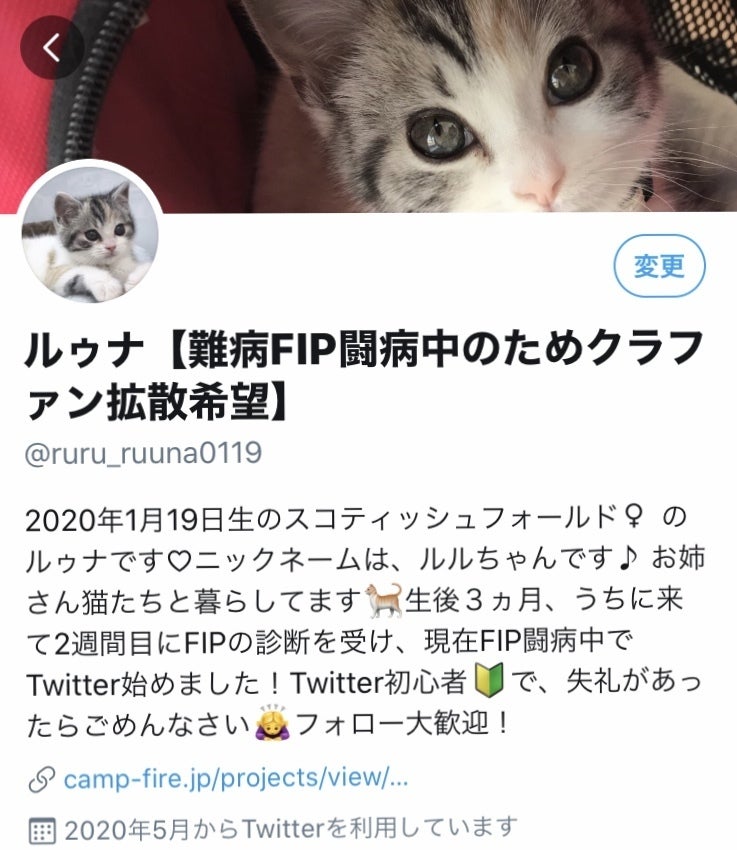 生後3ヵ月のルゥナに、『猫伝染性腹膜炎(以下:FIP)』の唯一の治療薬である『MUTIAN』の84日間の治療を受けさせてあげたいです。