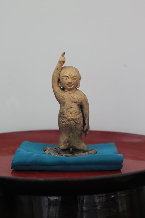 手び練りで成形し、釉薬をかけ焼成し、その後金釉、銀釉を施し焼きつけたものです。ちなみに誕生仏とはお釈迦様が産まれてすぐに右手は天を、左手は地を指し「天上天下唯我独尊」と唱えたとされるお話からできたものです。