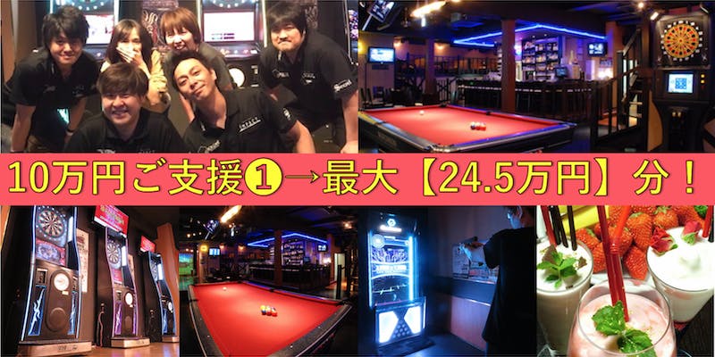 当店はダーツをはじめ、ビリヤード、シューティングガンアリーナ、カラオケを完備しており、皆様に幅広いアミューズメントと飲食をお楽しみ頂き、『日々の疲れを吹き飛ばして頂きたい』との想いで、これまで多くのお客様に支えられて、約15年年間営業をさせて頂いて参りました。