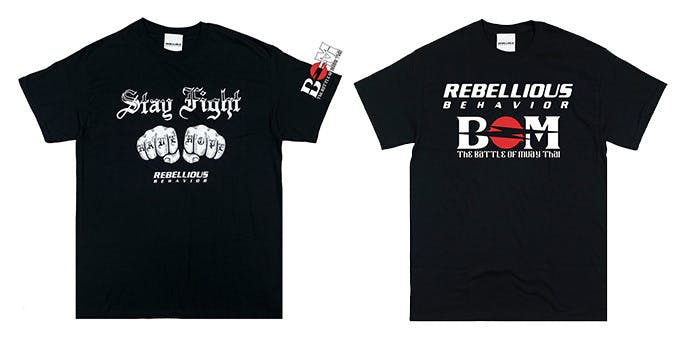 今大会に参戦する加藤有吾選手や実況・解説を務める朝陽・PKセンチャイムエタイジム選手をサポートしているアパレルブランド『REBELLIOUS BEHAVIOR』より、今回のクラウドファンディング限定のBOMコラボTシャツが届きました!