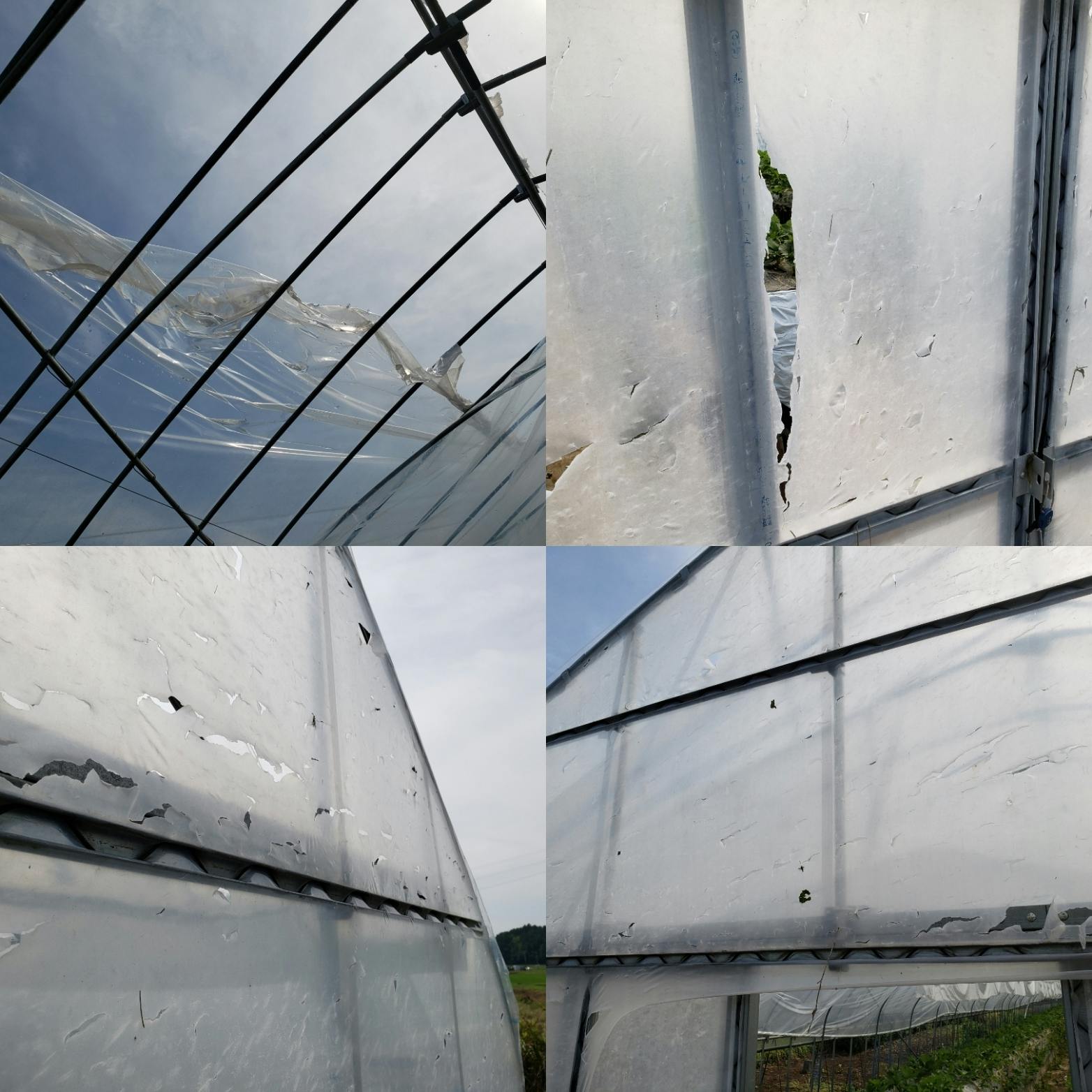 いちご狩り用のビニールハウス6棟にひょうが当たりハチの巣状態。