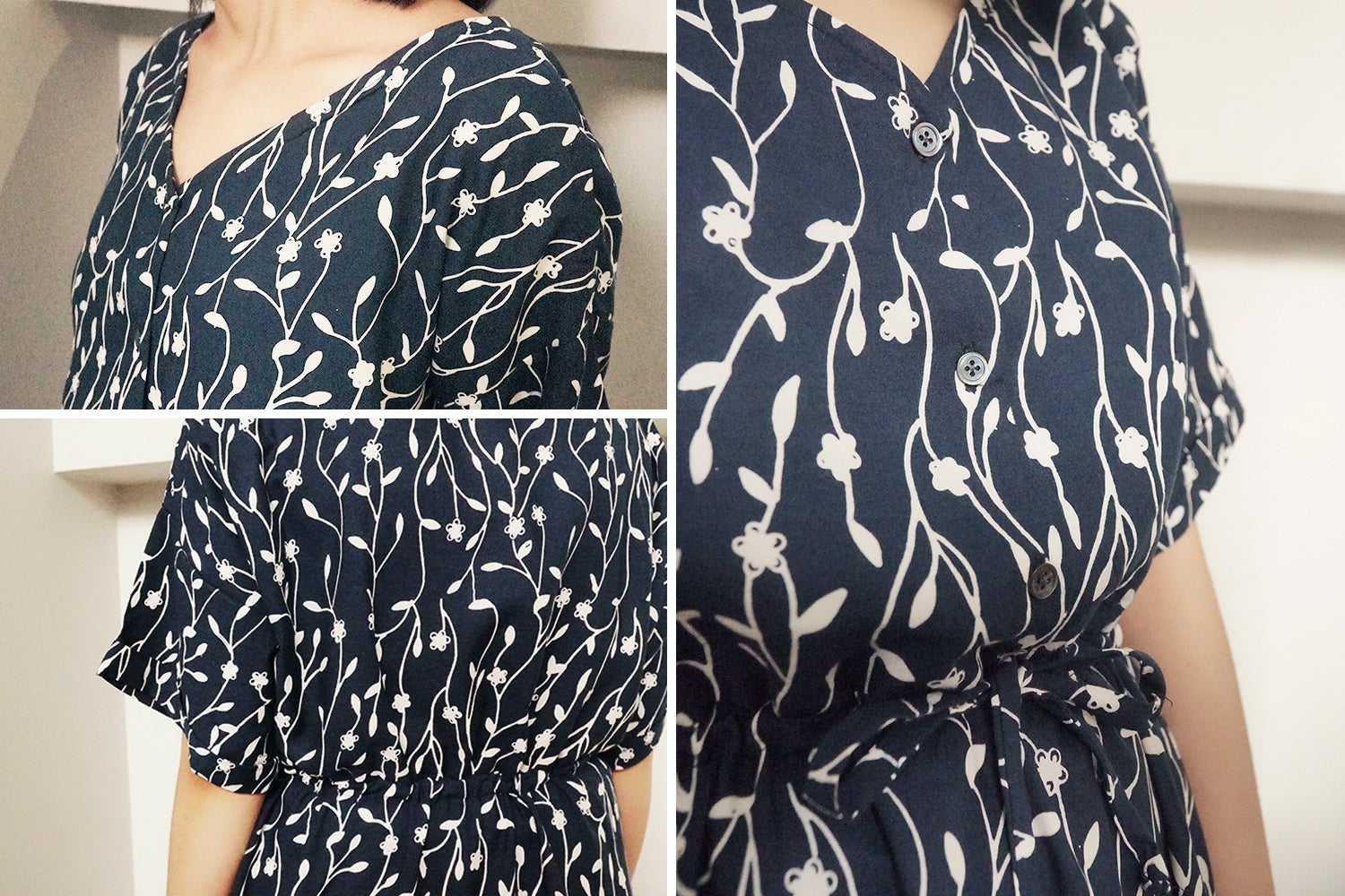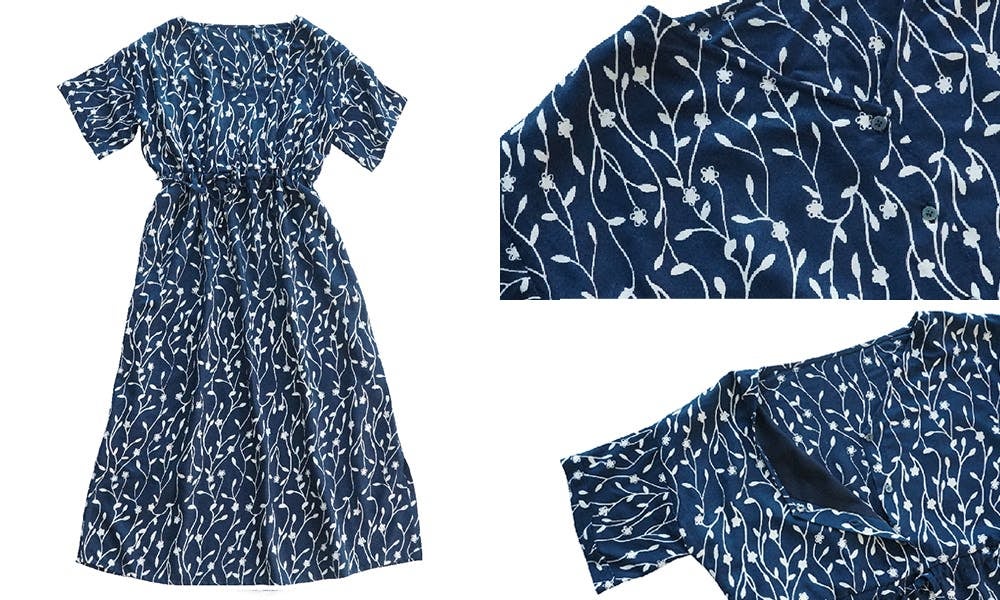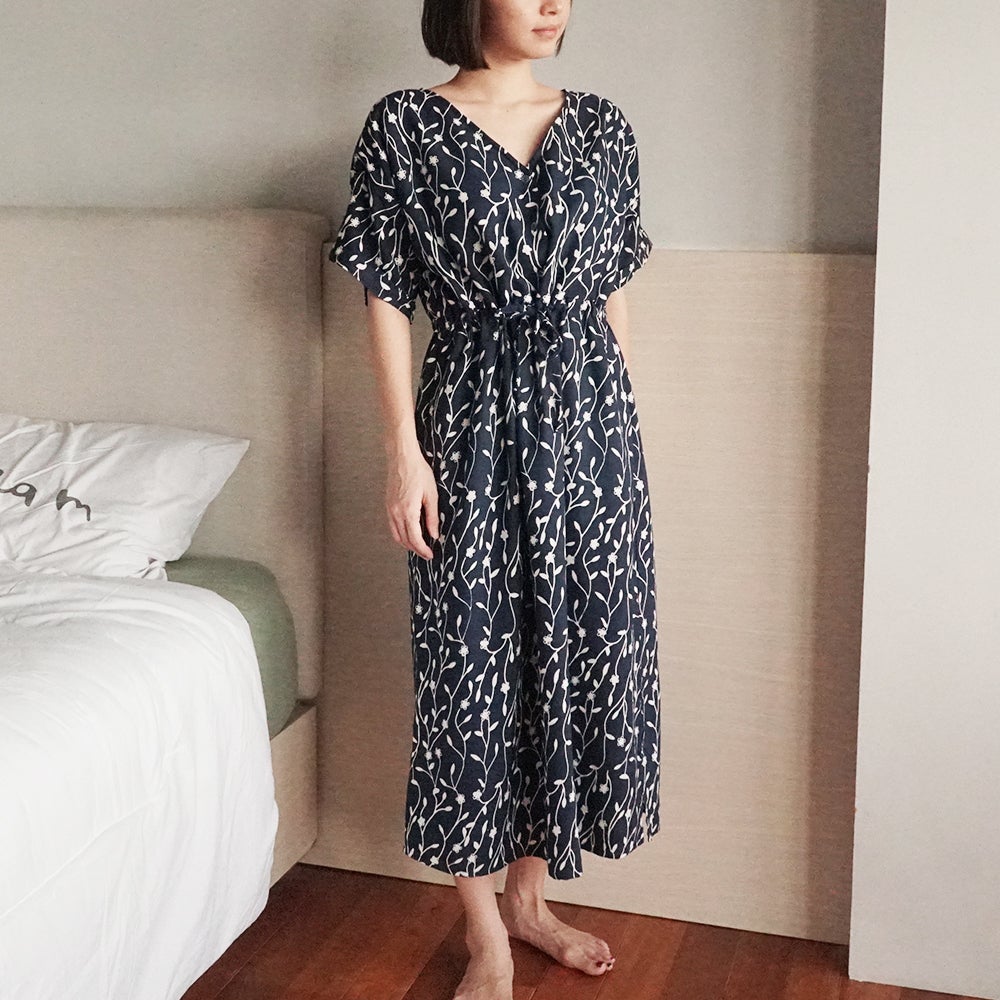 落ち着いたネイビーに、縦ラインのモダンなつぼみ柄が上品ですっきりした印象を与えます。