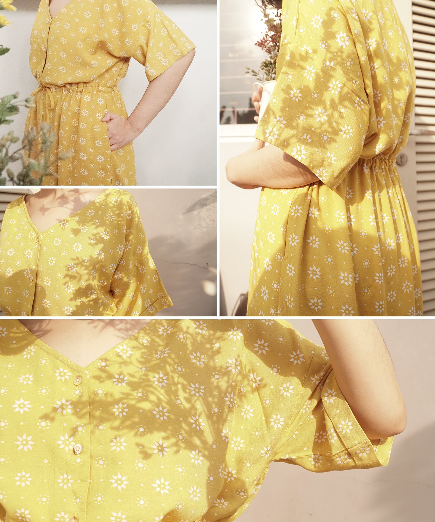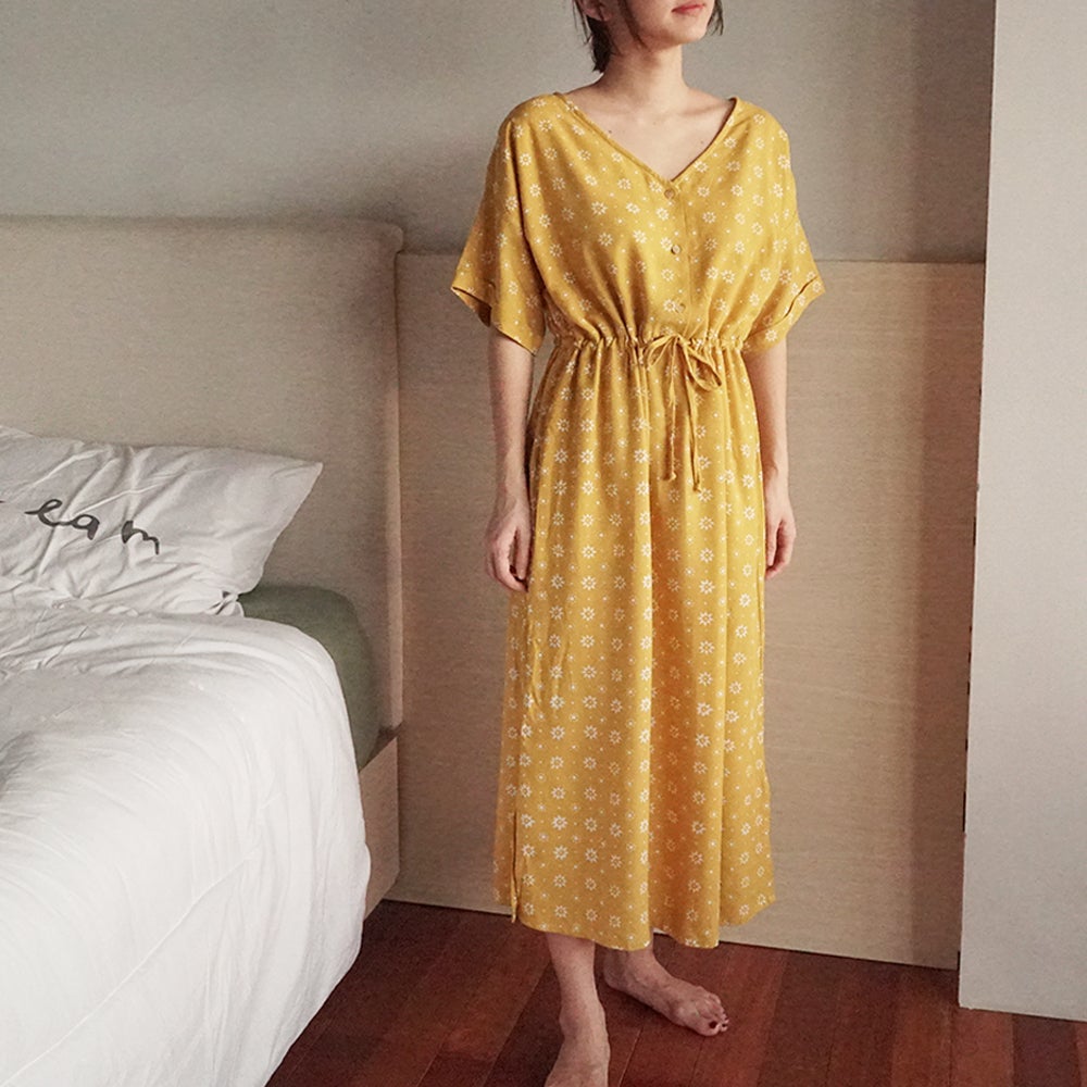 インドネシアでは「トゥルントム」と呼ばれる、夜空に輝く星がモチーフとなった伝統柄を、優しいマスタードカラーで染め上げました。