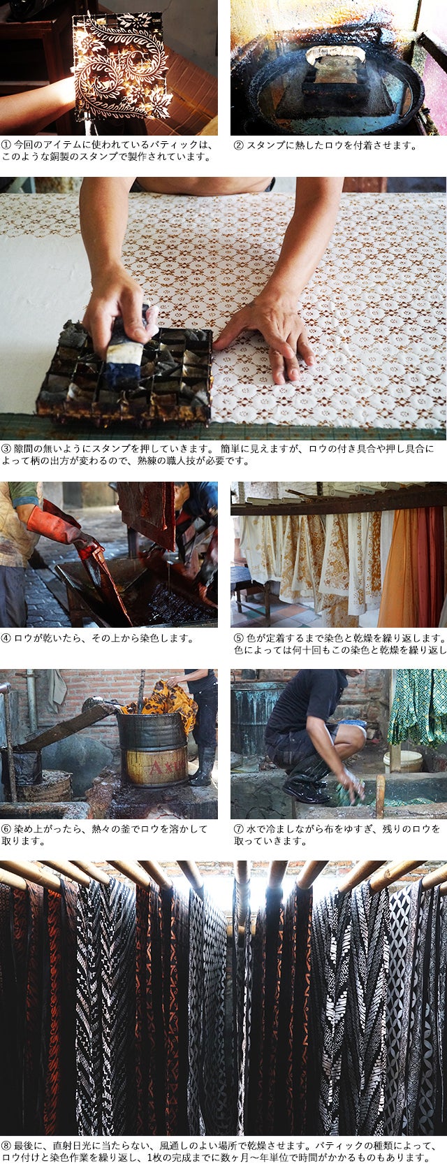 今回取り扱っているバティックのは、上記のような工程で、製作期間はだいたい1-2週間程度のものです。