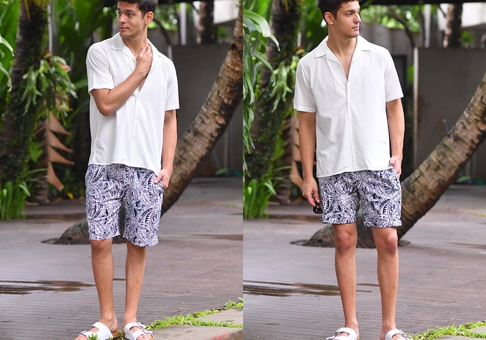裾を折って長さを調節してラフにも着れます。(左:通常着用時、右:裾調節時) モデル180cm, 着用サイズL