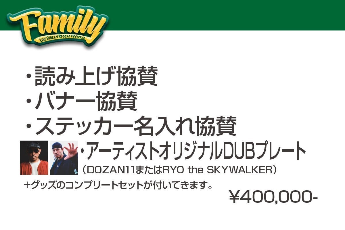 そしてさらに、FAMILYにも出演するDOZAN11もしくはRYO the SKYWALKERがあなた(企業様)用に曲の歌詞を変えて1曲プレゼントします!