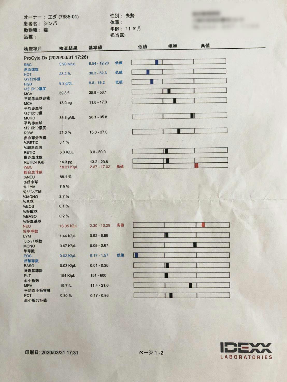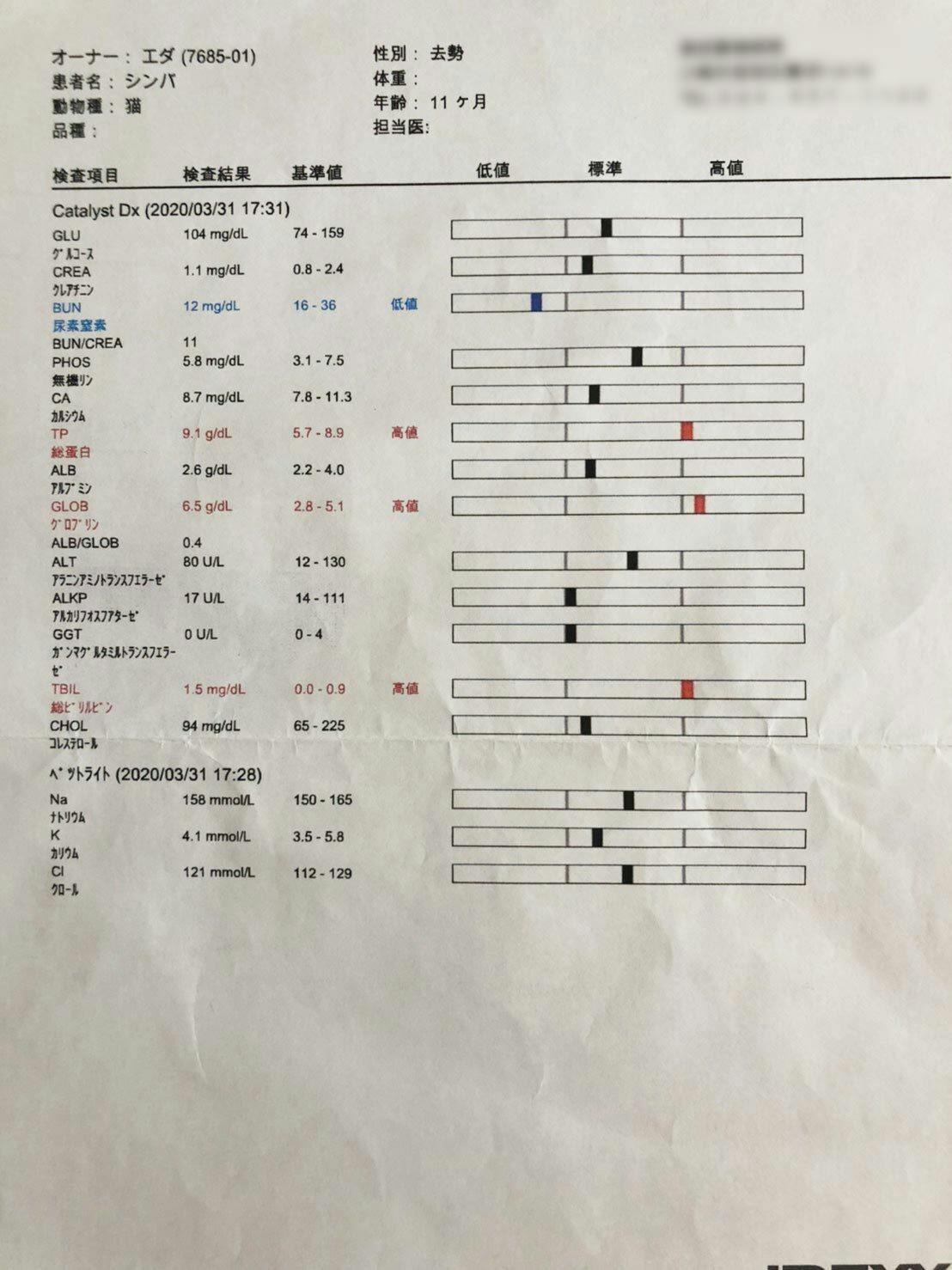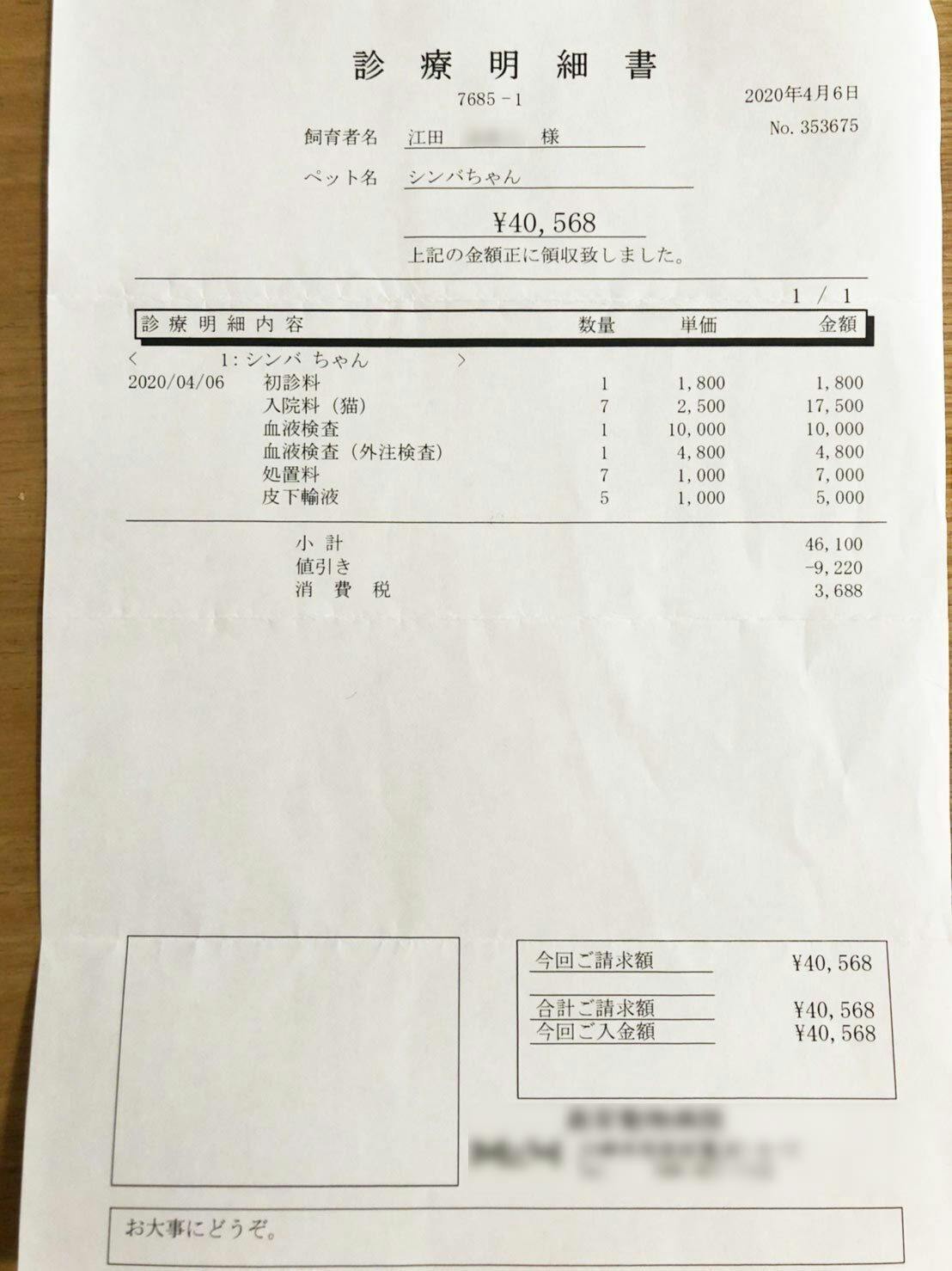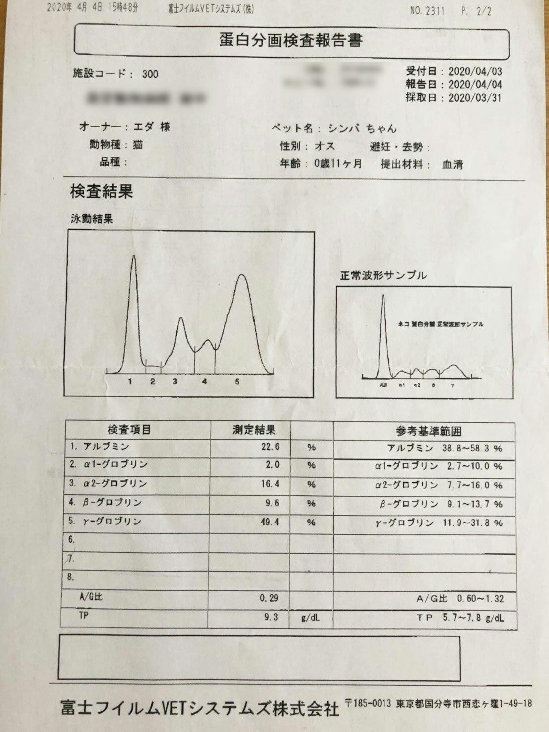 シンバは41度の高熱・黄疸があり、血液検査をし、先生から「厄介な病気かもしれない、猫伝染性腹膜炎(FIP)の可能性がある」と言われました。