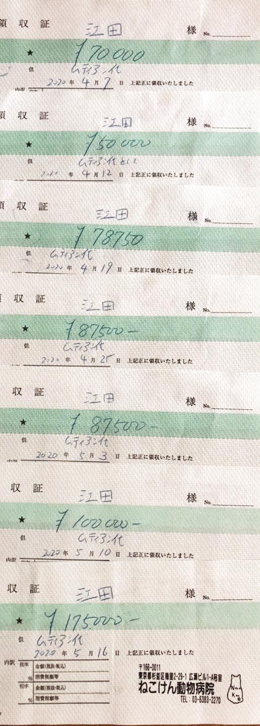 シンバはFIPの中でもドライタイプと言われるパターンで、身体の中に肉芽腫が出来るだけでなく、外にも肉芽腫が出来てしまいました。先生方も、多くのFIPの子を診て来た中で初めてのケースだとおっしゃっていました。そのため薬の量も多く服用しているので、更に高額な治療費がかかります。MUTIANの推奨継続服用期間は84日となっていますので、その間はどうにか薬を途切れさせたくないという思いが強いです。