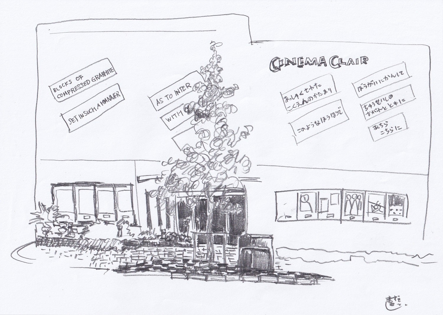 シネマ・クレールの外観です。CFの外観写真にも写っていますが、外壁に書かれた文字、なんだろう?と思われていた方もいらっしゃるはず。これは岡山で3年に一度開催されている「岡山芸術交流2019」のアート作品です。