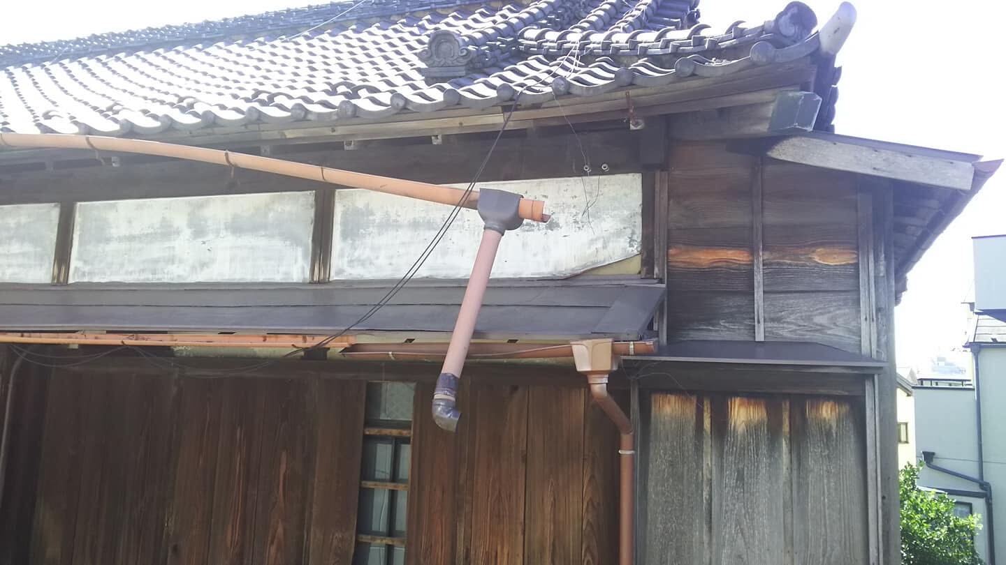 ▲台風で外れてしまった雨樋。現在は取り外しているため、屋根からの雨が外壁にかかり建物を更に傷めてしまう状態ですさらにこの春、新型コロナウイルスの蔓延により、お店の営業の自粛を余儀なくされました。