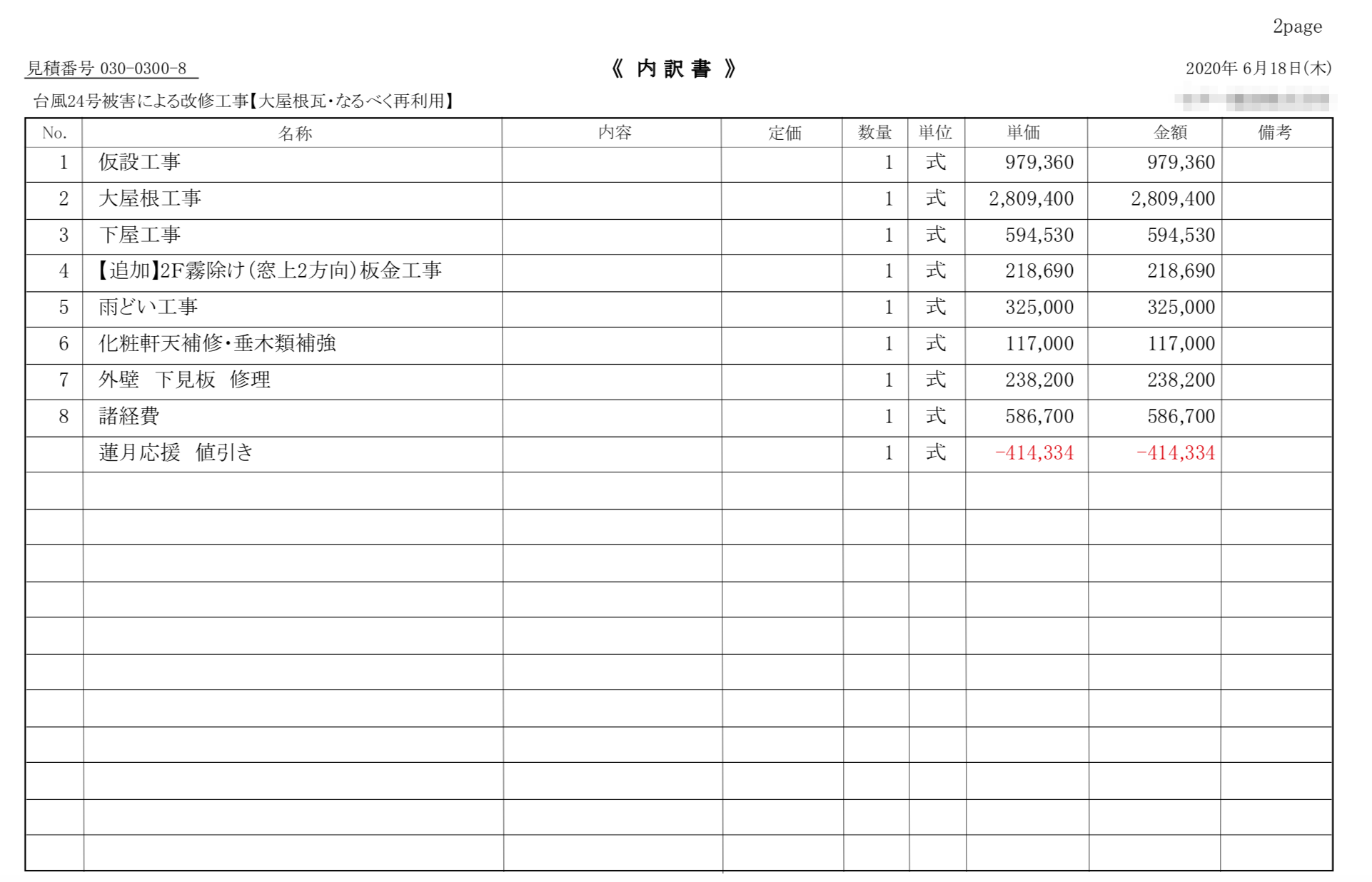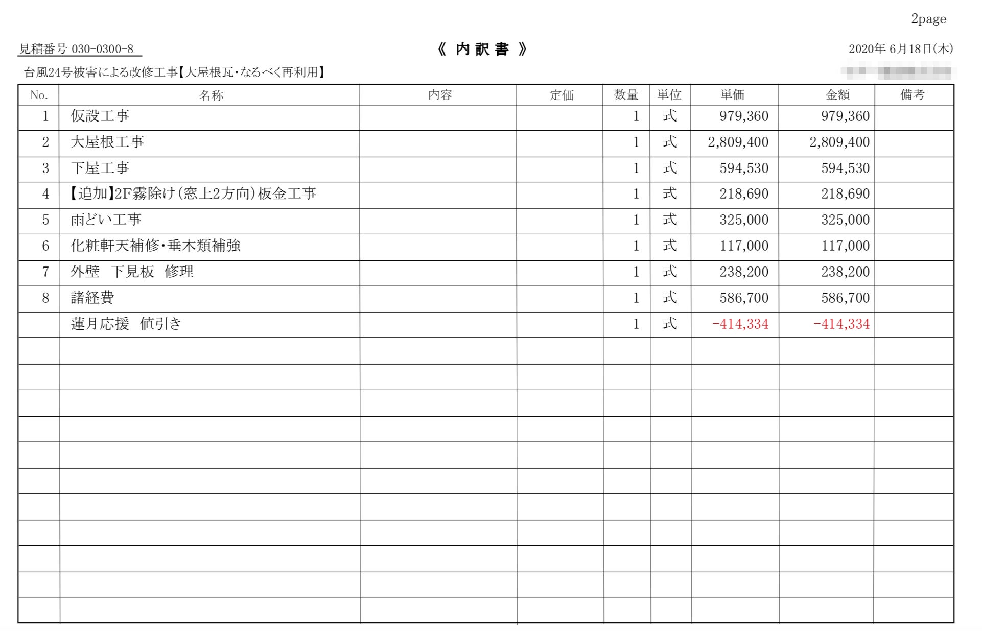 修繕費のお見積りは下記の通りです。