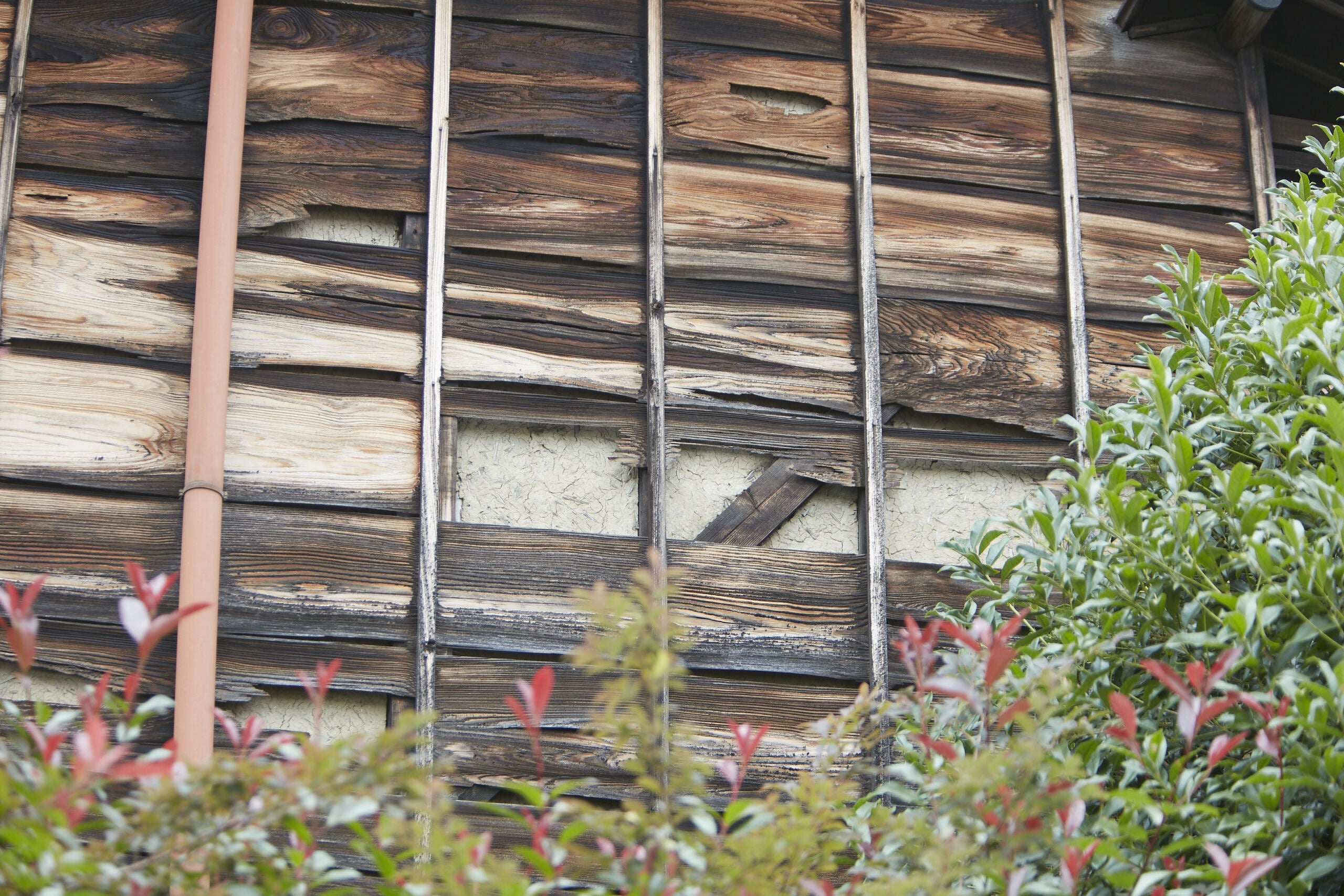 ▲外壁が剥がれて、土壁がむき出しになっています