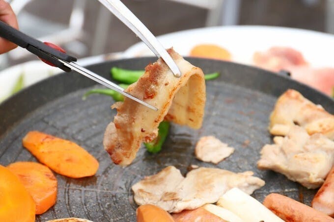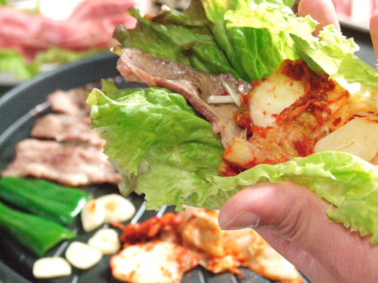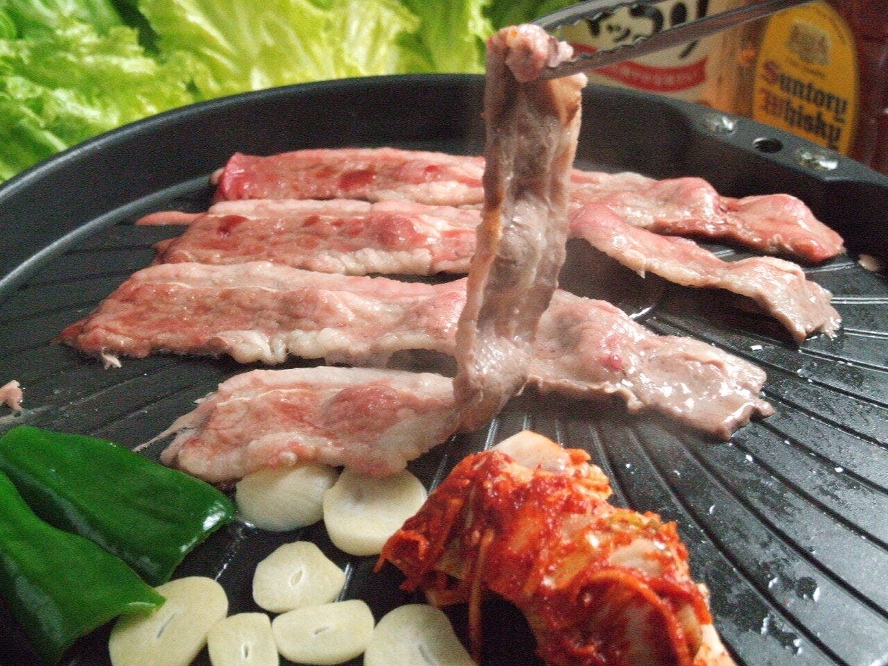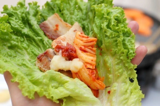 サニーレタスにお肉を包んで食べるのがおすすめ! 豚バラ肉や豚肩ロースをはじめとするお肉類や人参、ナス、玉葱などの野菜類やキムチ、ナムル、カレーなどのサイドメニューも食べ放題!