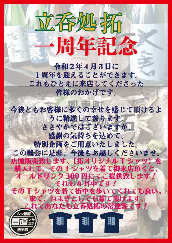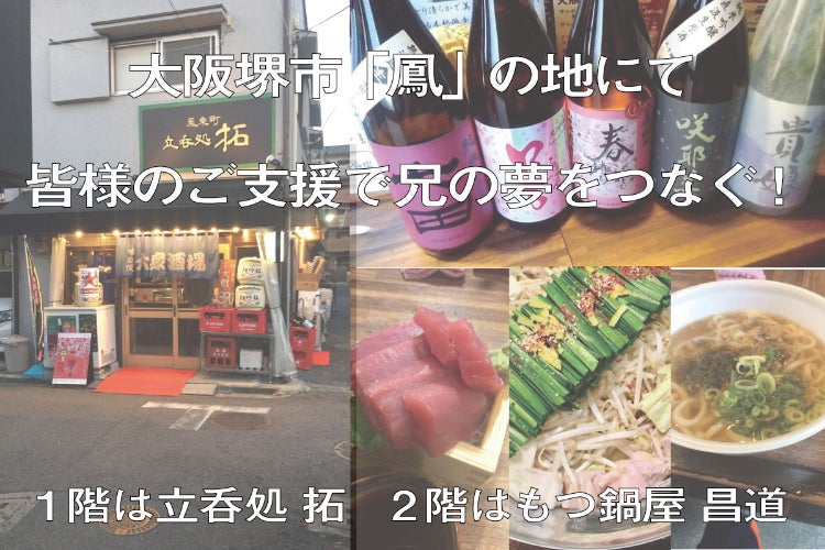 初めまして。堺市、鳳で「立呑処 拓」と1日1組限定予約の、もつ鍋屋「昌道」の2店舗を