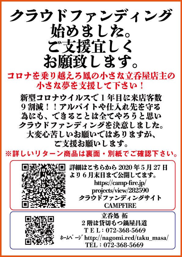 いつも、ご支援、応援ありがとうございます。 近隣でクラウドファンディングされている (株)ルピナス様に個人の3輪バイクを 昨日売却しました。 しおじん、とりしん、活け活け魚魚、ハピドンと 鳳駅でんでん坂にて、 営業されているお店様です。 オーナー様から、 出前に力を入れたいという事を聞き、 個人的に3輪バイクを所有してたもんで、 お声かけさせてもらい、 超格安で売却しました(笑) 新型コロナウィルスの影響で、 延期、実施できておりませんが、 鳳バル実行委員会として、 社員さんも実行委員会の、 仲間に入っているご縁もあり、 なにか協力できる事ないかなと、思いましてね… ここのオーナーの凄い所は、 自らも現場に入り切り盛りされている事です。 そして、良いイメージの未来が見えている… 鳳にある他の店舗への出前も考えてるとの事。 うちで、ラーメン出前もありやなー 超前向きな方なので、なんでも取り組み、 そして実行力もある! ホントにスゲーオーナーです。 うちに焼鳥とかラーメンとか 持ってきてくれたら、 めちゃくちゃおもろいやん。 そりゃその日の売上にはならんけど、 お客様がそれで喜んでくれたら、 それで良い。 絶対、コラボしよっと(笑)