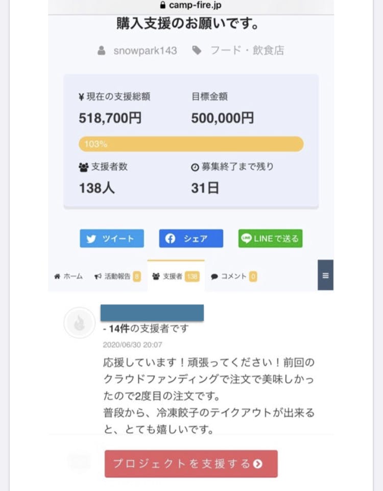 前回のクラウドファンディングでご支援頂いた方より、今回2回目のご支援をして頂きました。