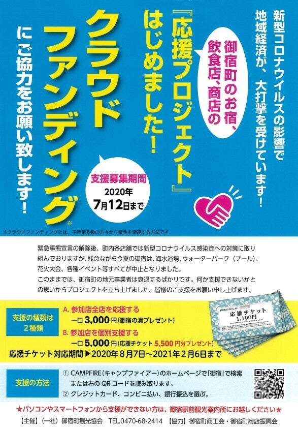皆様、こんにちは。御宿町観光協会です。多くのご支援、誠にありがとうございます。御宿町観光のためにと立ち上げた本プロジェクトへ町内事業者よりサポートが届きました‼誠にありがとうございます。クラウドファンディング募集ポスター、チラシをボランティアで作成いただきました‼誠にありがとうございます。参加店の協力とともに御宿町役場にもご協力いただき、ポスターの掲示やチラシ配布を行っております。より多くの皆様に情報がお届けできればと思います。また、参加店からもメッセージが届いておりますので、随時、皆様にご紹介いたします。よろしくお願いします。