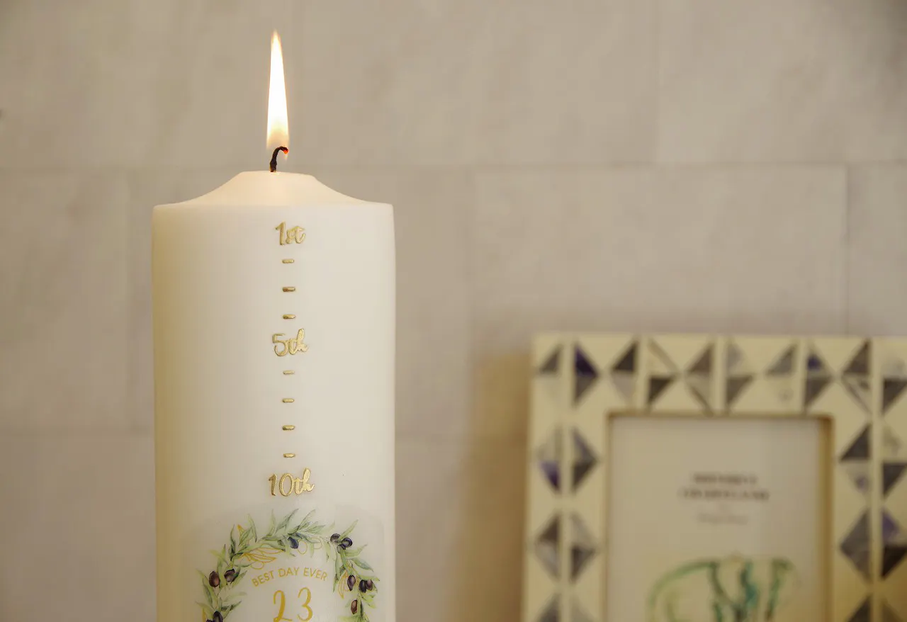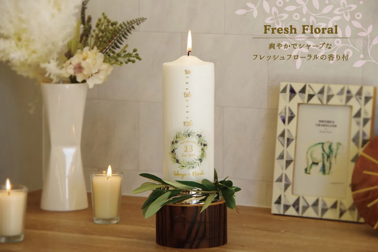 キャンドルのオリーブの中には結婚記念日が、その下にはお二人の名前が入ります。