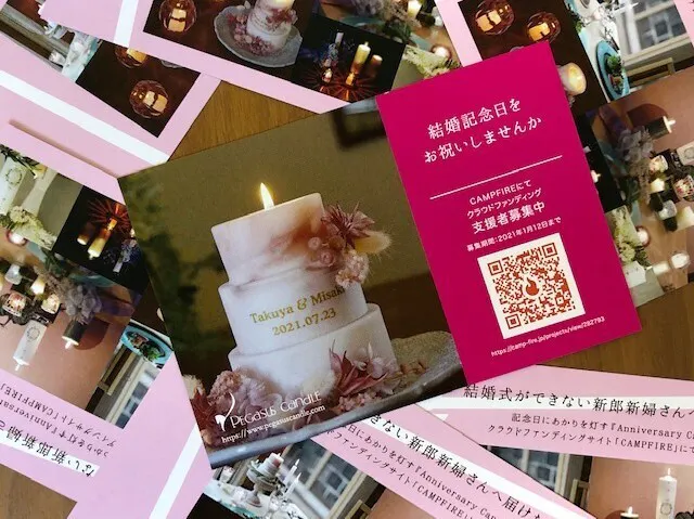 2020/12/22 11:42ペガサスキャンドルのHiraと申します。「コロナ禍でも一組でも多くの新郎新婦へ幸せをお届けしたい」そんな想いからクラウドファンディングを利用させていただきました。ですが、初めての取り組みで要領が分からず四苦八苦しております。DMを作成しいくつかのお店にもご案内させていただきました。新型コロナの影響は、結婚式の延期や中止17万組 損失6000億といわれています。 またコロナ第3波が報道され、不安に過ごされている方も多いと思います。新郎新婦「結婚式ができない、でも何らかの形を残したい」 「写真はあるけど・・祝うにはさみしい」親族・友人「身内だけでもお祝いしたい」「記念に残るもの二人へ届けたい」「気持ちが伝わる 世界にただ一つのものを贈りたい!」 ペガサスキャンドルは、お二人の気持ちに寄り添って幸せな時間を応援したいです!一組でも多くの新郎新婦へ、幸せを届けるご協力をお願いします!! もっと見る