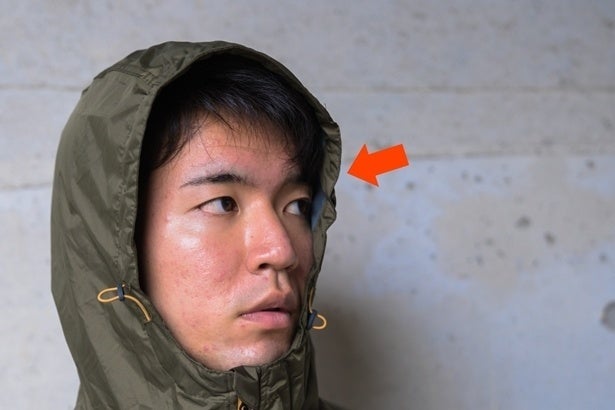 まず、フードも含めたフィット感がいいですね。襟や袖、裾など要所はしっかりと浸水しにくくなっています。特にサイドの顔脇のラインは、雨が入りにくいのに見やすくというしっかりとした作りに、好感がもてました。バイザーは、運転時に前傾気味になっていても視界は確保されているし、右後ろにリフレクターがついていたりと、自転車乗りのことをきちんと考えられているなと感心しました。
