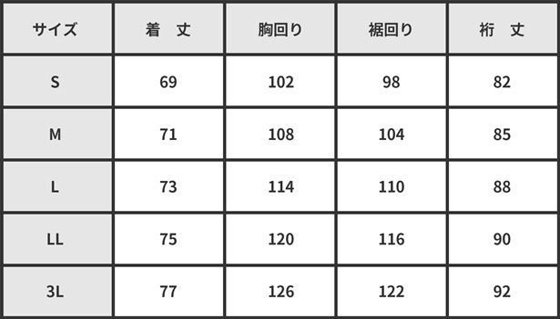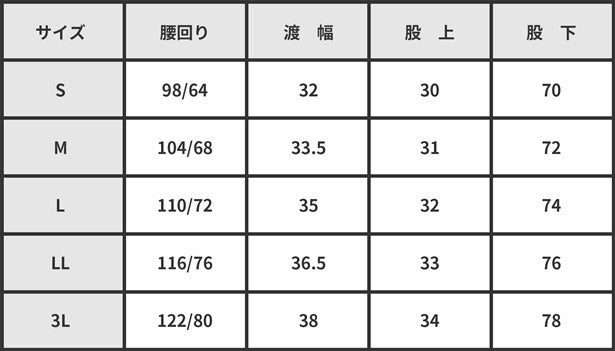 【サイズ】 S/M/L/LL/3L 合計5種類