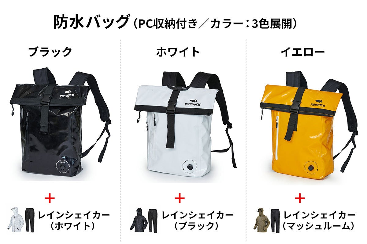 雨の日に一緒に使用して最高の使い勝手を実現する、カジメイク製「ピラルク」ブランドの防水バックパックです。