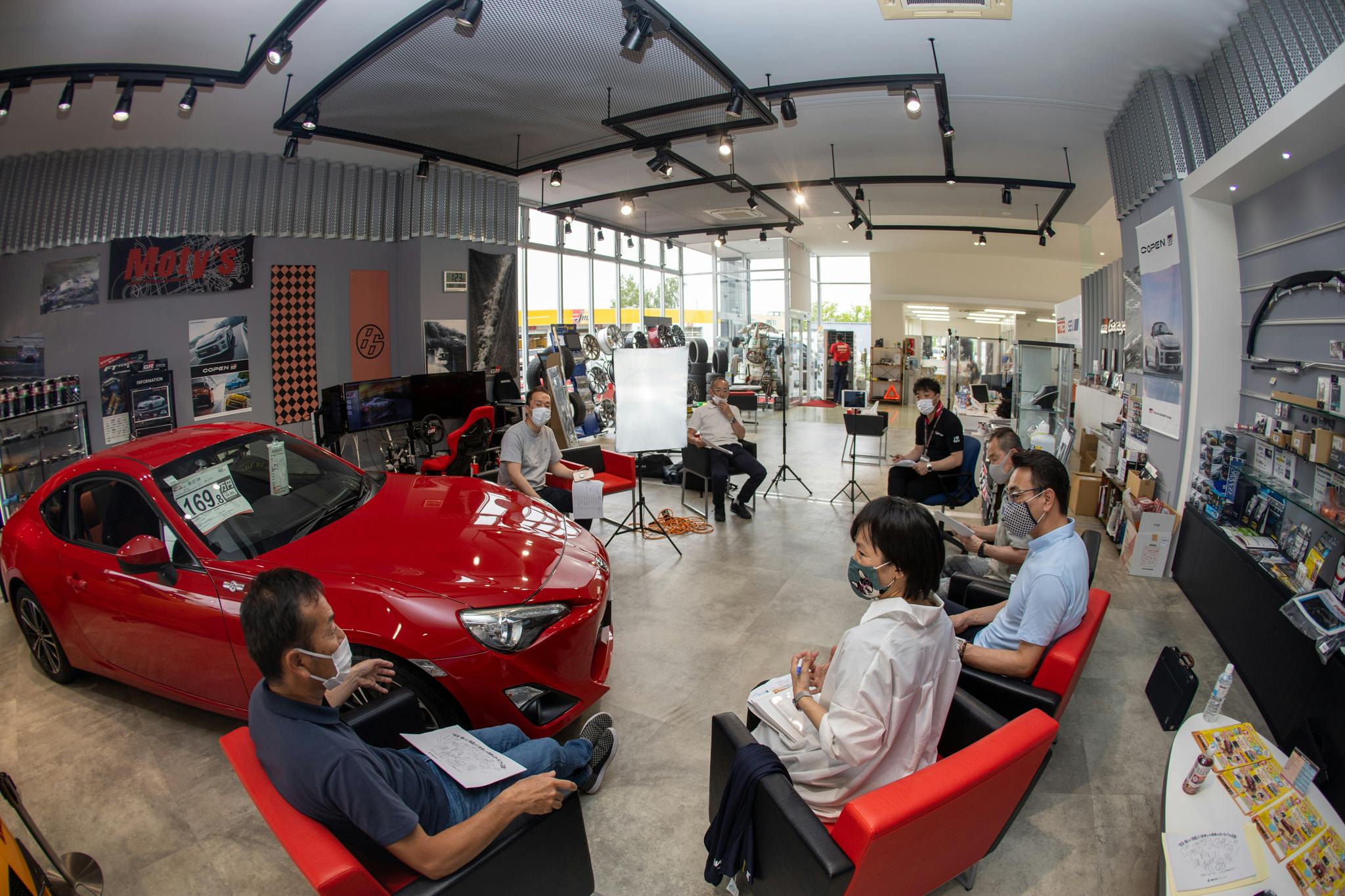 店内にあるレーシングシュミレーター!楽しそう!ですが、まずは打合せを・・撮影にご協力いただきます、GR Garage 札幌厚別通の古島さん(左)、プロラリードライバーの奴田原さん(右)です。撮影内容のチェックをして行きます。