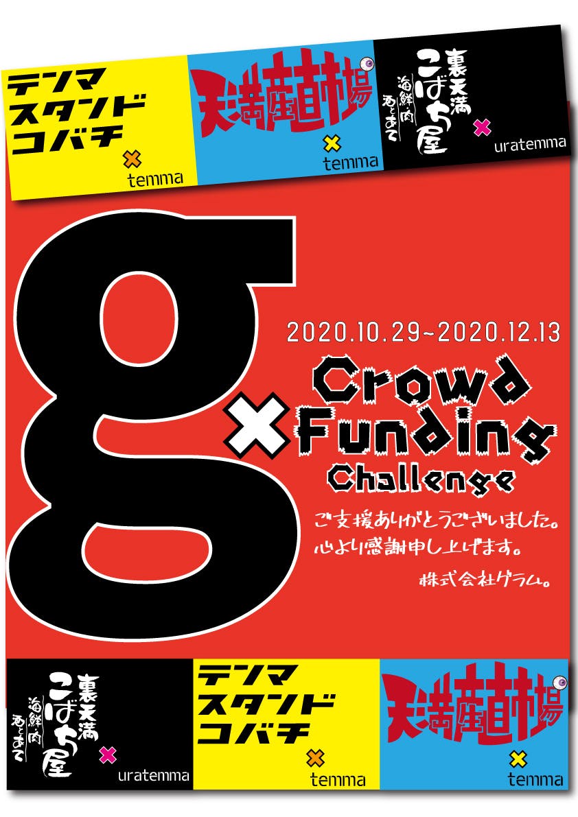 2021/02/16 01:04クラウドファンディングへのご支援へのお礼クラウドファンディングへのご支援者様へのお礼が遅くなり申し訳ありませんでした。はじめに、株式会社グラム(天満産直市場、裏天満こばち屋、テンマ スタンド コバチ)は2020年10月29日~2020年12月13日までクラウドファンディングを実地致しました。結果、目標金額に届きませんでしたが、コロナ禍で皆様におかれませても大変な状況下のなか1,362,000円ものご支援をいただき心より感謝申し上げます。なお頂戴したご支援は店舗継続の為に大切に使わせて頂いております。コロナで世の中は一変し、飲食店を経営するうえのウイルス感染への恐怖や、先のみえない不安と厳しい状況のなかでのクラウドファンディングへの挑戦でした。この挑戦でご支援いただいた皆様からの温かいお心遣いと、この状況を前向きに立ち向かう勇気と貴重な経験いただき、私自身、何事も諦めず努力する事への大切さを改めて感じました。お店の営業もお客様に笑顔でご安心してご利用頂けるよう、今まで以上に安心安全な環境を目指し、皆様へご飲食を通じ恩返しできるよう努力する所存でございます。一日も早いコロナウイルスの終息と、皆様のご健康を心よりお祈り申し上げます。なお、ご支援に対するリターン(返礼品)につきましては、緊急事態宣言の影響もあり予定より準備が遅れてしまっています。大変申し訳ありません。※2月下旬頃から3月中旬にかけて順次発送させていただきます。大変お待たせすることになり恐縮でございますが、何卒ご理解のほどお願い申し上げます。 もっと見る