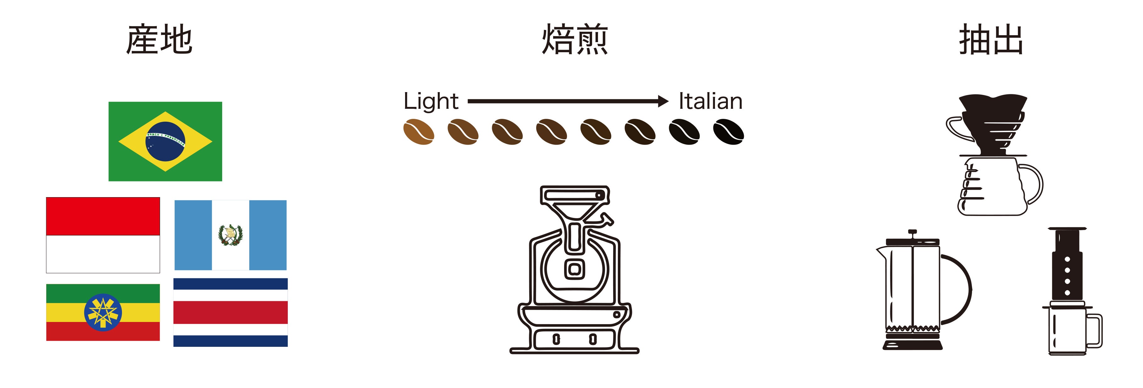 これらの各工程全てがコーヒーの味を決める重要なセクションです。また組み合わせることで自分好みの味が見つかります。