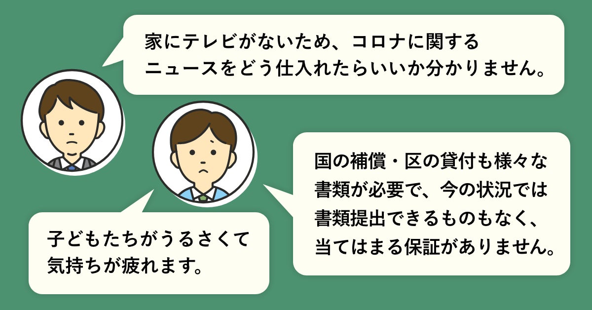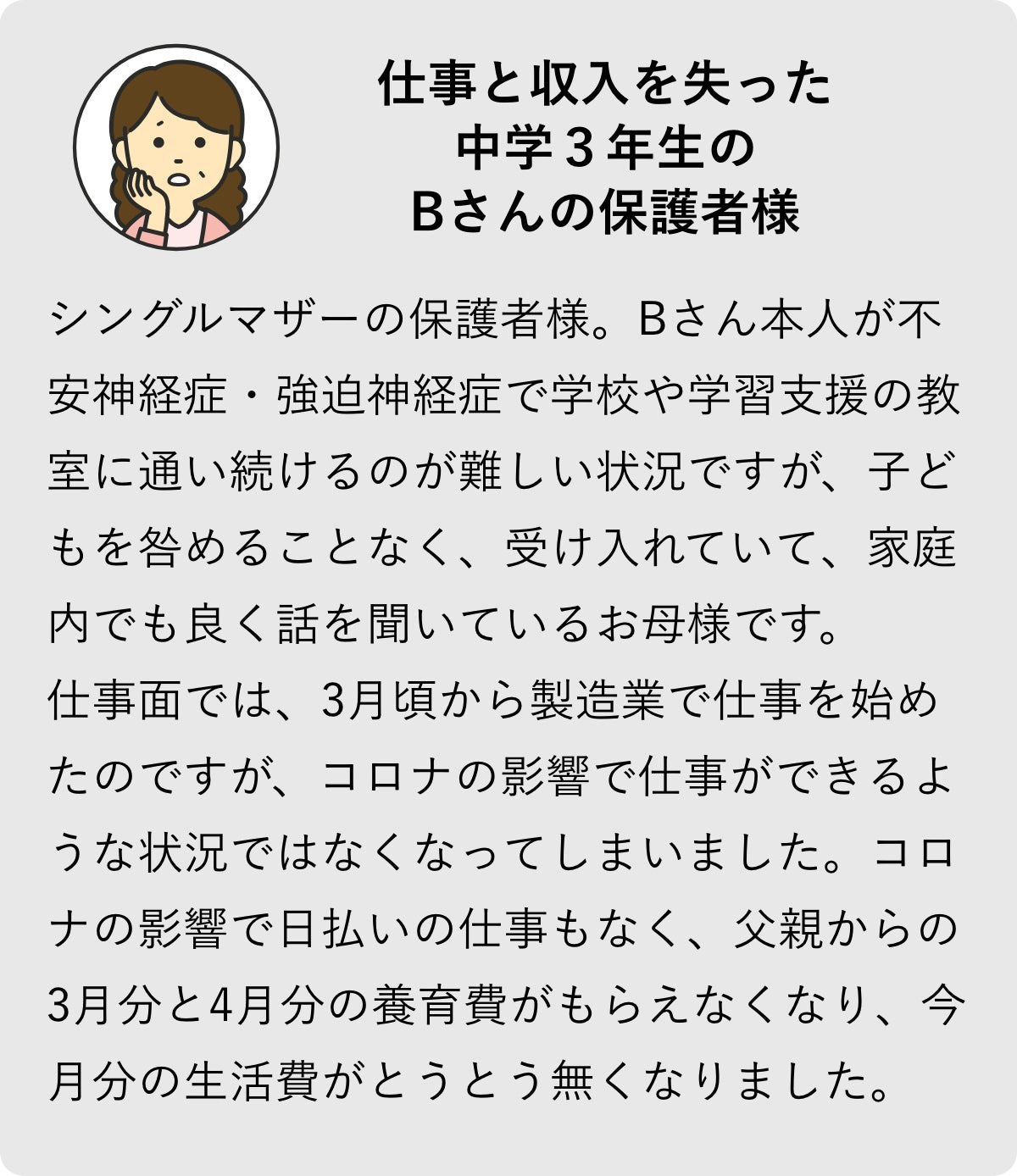 保護者様の声から、仕事の減少によって収入が減少していること、食費・生活物資が不足していること、情報不足によって孤立していること、精神的ストレスがあるという現状が明らかになりました。