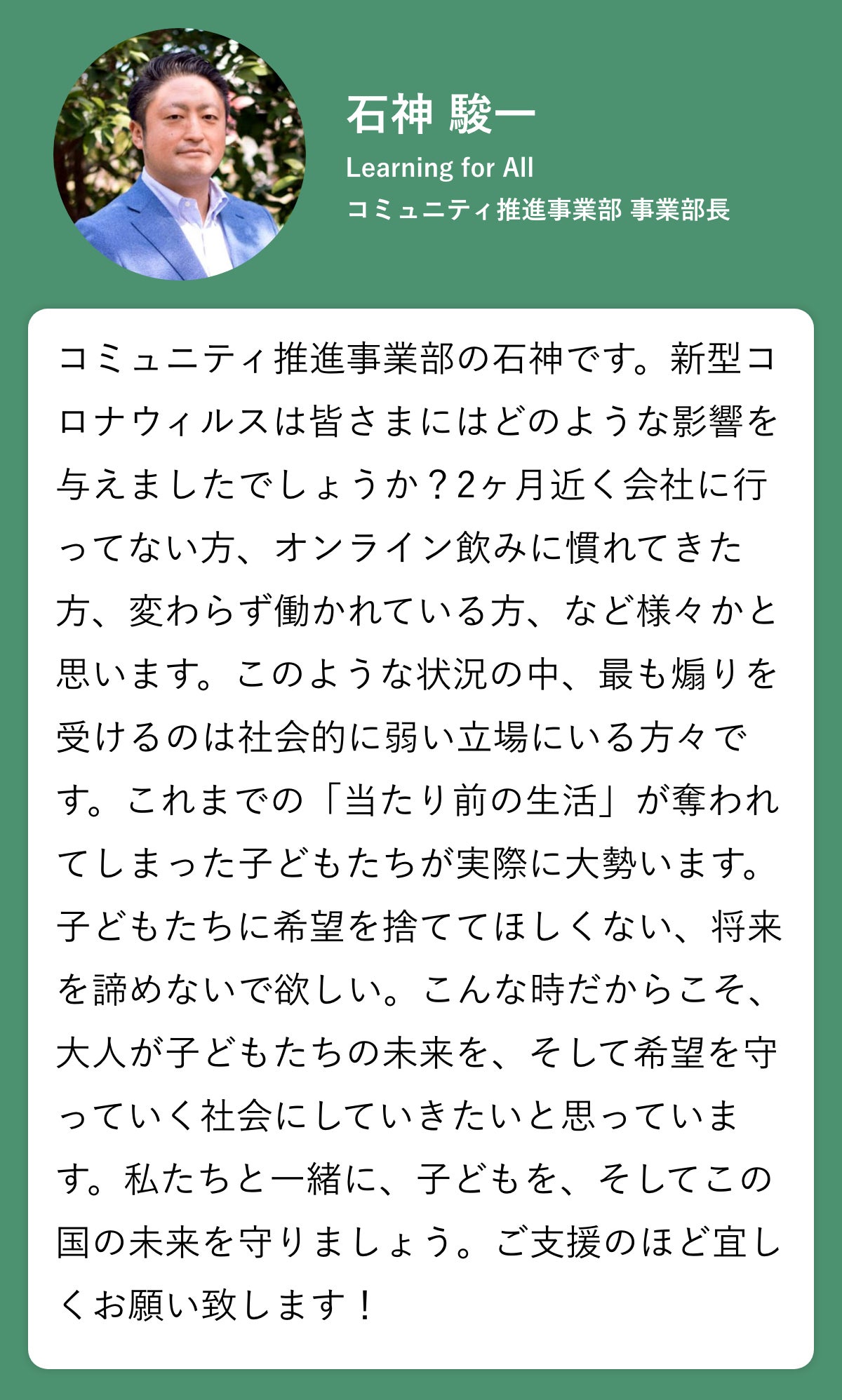 2月末の突然の学校休校、そして緊急事態宣言とその延長による学校休校の延長により、子どもたちの置かれる状況は一変しました。給食がなくなった影響で十分な食事を取れない子ども、学校という学びの機会を失い学びたくても学べない子ども、虐待などの影響で家に居づらいにも関わらず家に居なくてはいけない子ども。Learning for All は関わる子どもたちの声を聴き、そうした多くのニーズをキャッチしてきました。子どもたちにとって、学びや育ちの環境が失われることは、短期的には健全な発達を阻害し、教育格差をさらに拡大させていきます。そして、そうした格差は、今この瞬間にも開き続けています。それは、将来の子どもたちの可能性を少しずつ狭めていきます。今この瞬間から、一人ひとりの子どもたちの学びと育ちの環境を支えることが重要です。また同時に、保護者様の置かれる環境も深刻です。学校がなくなり、食費や光熱費など日々の出費も増える中、仕事と育児の両立はさらに難しくなり、大きなストレスを抱えています。子どもや保護者を支えるライフラインにも黄色信号が灯り始め事態は一刻を争います。子どものみならず、保護者様含めた家庭丸ごとの支援が求められており、それこそが子どもたちの今と未来を守ることに繋がります。そして、こうした課題は全国共通の課題であり、全国の支援団体も取り組みを始めています。そうした全国の団体にLearning for All のノウハウを提供することで、ひとりでも多くの子どもたちに今必要な支援を届けたいと考えています。
