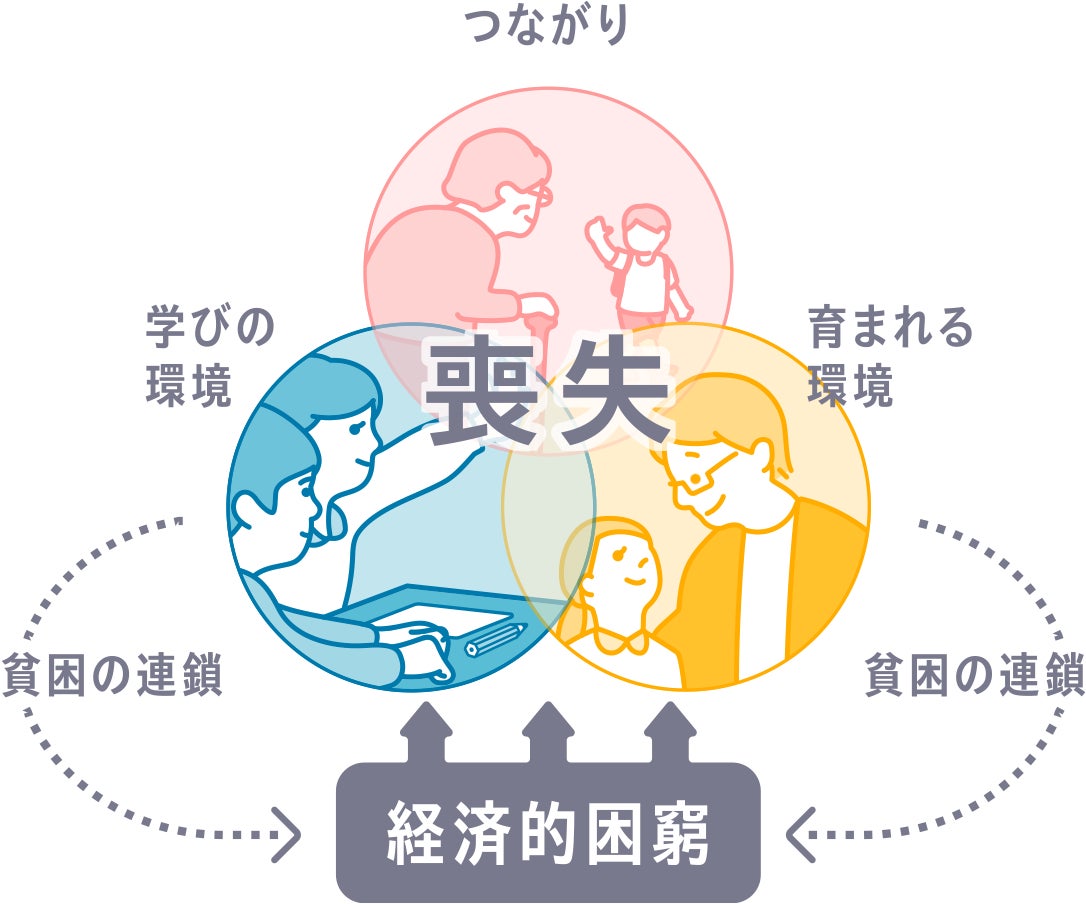 相対的貧困状態にある子どもたちが抱えている困難は、経済的な基盤がないことだけではありません。経済的な基盤がないことに加えて、「つながり」「学びの環境」「育まれる環境」をも喪失しやすくなる傾向があります。