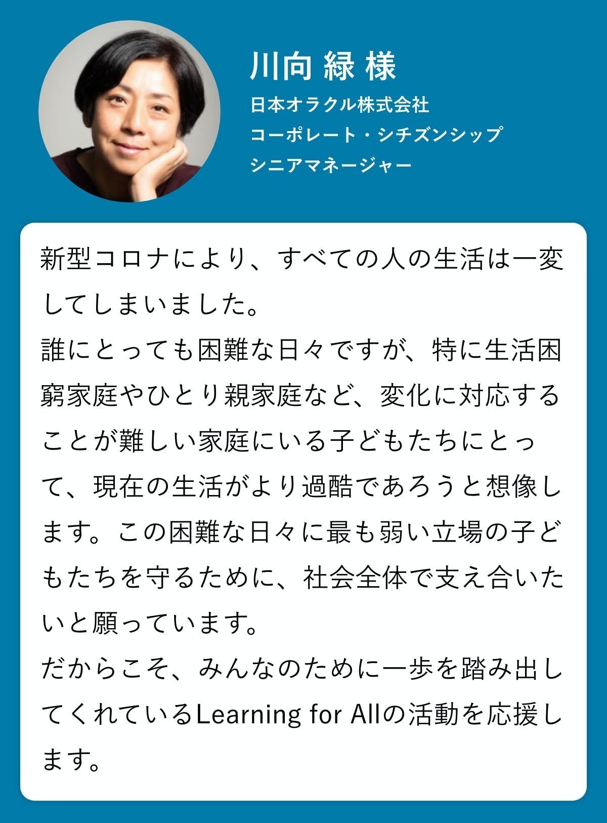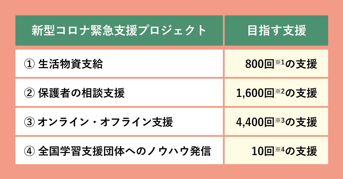 そのアンケート結果から明らかになった、子どもたち・保護者様が今必要としている支援を届けるため、「新型コロナ緊急支援プロジェクト by Learning for All 」を発足し、すでに支援を開始しています。