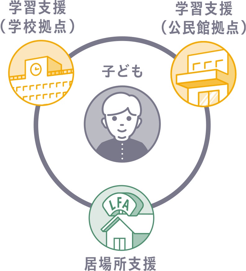 つながり、学びの環境、育まれる環境を整備するため、地域の中に複数の学習支援拠点と居場所支援拠点を設け、地域の多様なステークホルダーと連携・協力しながら、1人の子どもが生まれてから自立していくまでの1つの生活圏に、すべての支援・機会がそろう、困難を抱えた子どもたちへの包括的支援モデルの構築に着手しています。